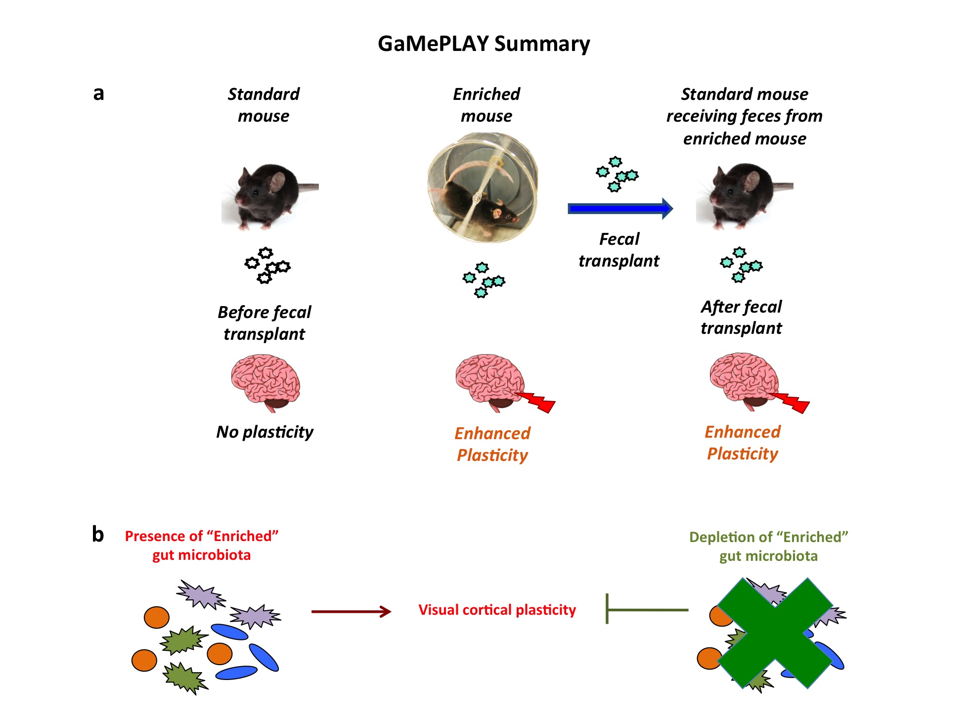 It is becoming clear that the gut microbiota influence brain function and finally behaviour. The data collected by GaMePLAY are helping to understand the microbiota role on brain plasticity. My results show how the faecal transplant of a “pro-plasticity microbiota” enhances brain plasticity in adult rodents, which generally do not display this property. Moreover, the identification of specific bacteria strains might help to discover new probiotics. This is particularly relevant for therapy, with a consequent tremendous impact on society. Indeed, probiotic treatments can be easily applied in humans, opening exciting opportunities for treating neuropsychiatric diseases with microbiota based-therapies.