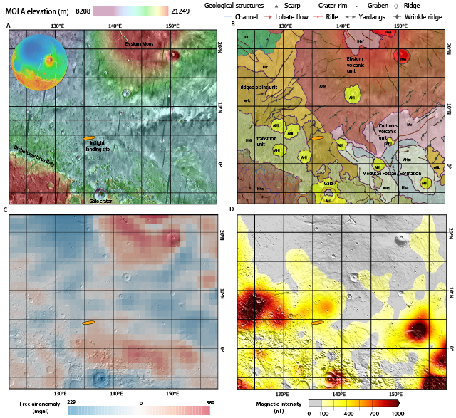 First (WP1), to characterize the geological and geophysical background of the landing site, we organized previous geological maps of this region and investigated the morphological features of the landing site. We identified local geologic history background based on previous studies and geological mapping works in the InSight science team. It has been shown that InSight landing ellipse is located near the dichotomy of Mars with complicated geologic history. We also delineate a region within ~500 km from the landing site that is relevant to the upper several kilometers of the crustal structure of the landing site for further study.