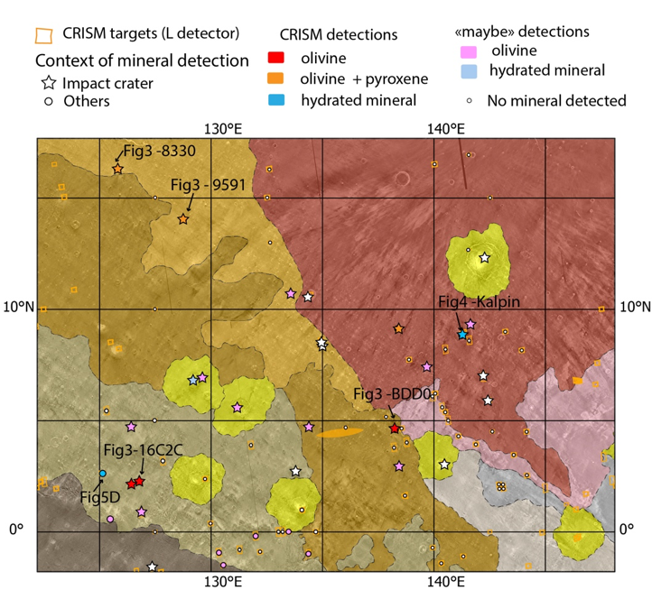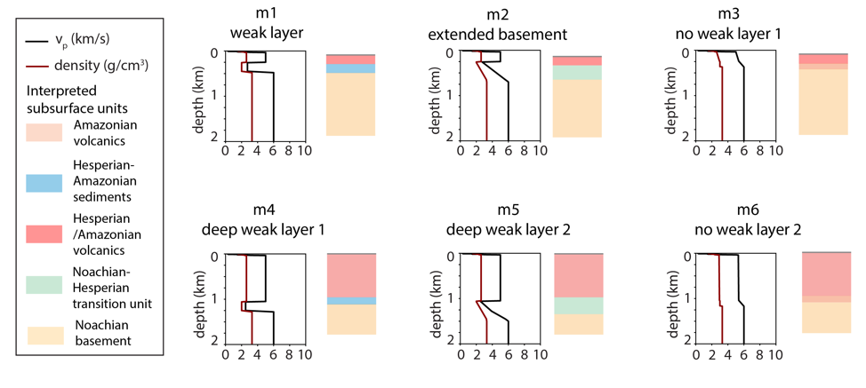 Lastly (WP3), we used several different methods to calculate the possible burial depth before excavation for the craters that expose layered sediments and phyllosilicates. We then compile seismic wave velocities and densities of materials on Earth that are relevant to Mars in a dataset. Combining the wave velocities and densities and depths from geological observations, we made a set of possible crustal models for seismologists to test their forward models and for comparison with InSight seismology data.