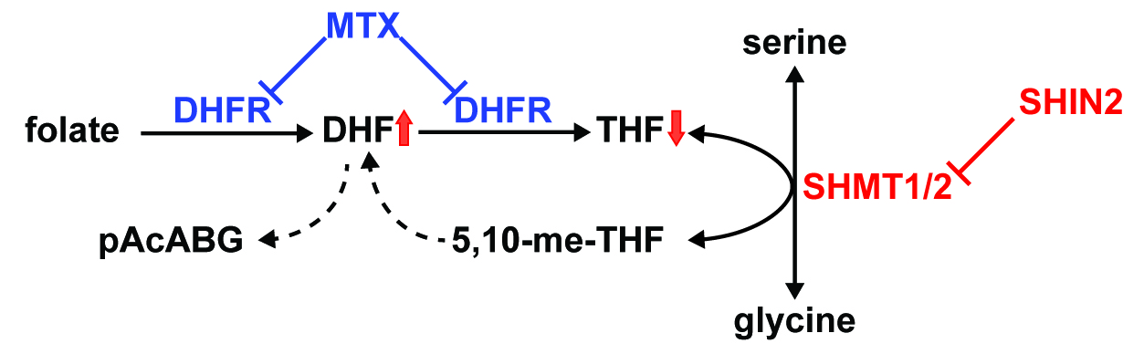 Antifolates (e.g. methotrexate and pemetrexed) are well-stablished treatments for cancer and autoimmune diseases. However, development of resistance is a common phenomena. The mitochondrial isoform of SHMT (SHMT2) is strongly upregulated in cancer and is the main source of 1C units for nucleotide biosynthesis in several cancers. SHMT 1/2 inhibitors effectively inhibit cancer cell proliferation in vitro. We have developed the first dual SHMT1/2 inhibitor, SHIN2, with favorable PK/PD profile for in vivo use and demonstrated in vivo target engagement by using a newly developed method combining isotope tracers and LC-MS-based analysis of serum metabolites. We showed that SHIN2 alone is effective and increases survival in a T-ALL mouse model in vivo and that synergizes with the antifolate drug methotrexate both in vitro and in vivo in mouse models of T-ALL. Moreover, cell rendered resistant to methotrexate remain sensitive to SHMT1/2 inhibition by SHIN2/. Thus, not only we have provided tools for evaluating SHMT 1/2 in vivo, but we have also identified that SHMT inhibition offers a complementary strategy in the treatment of T-ALL.