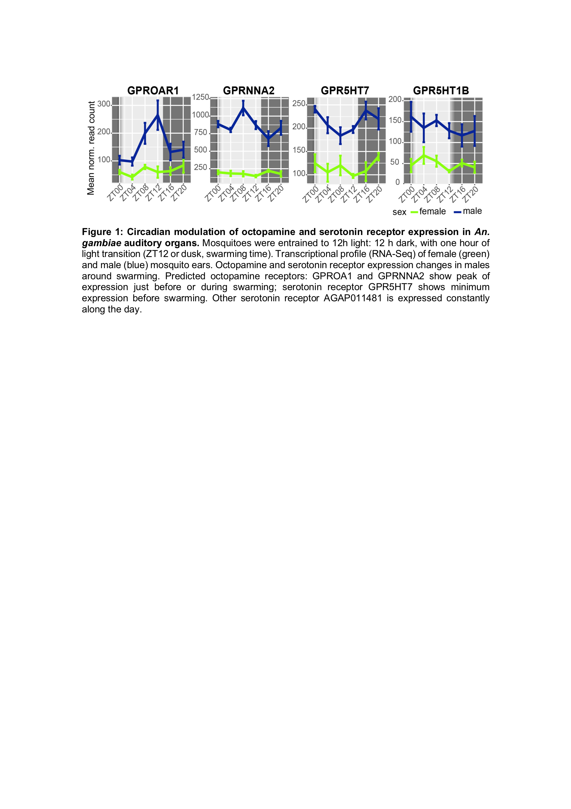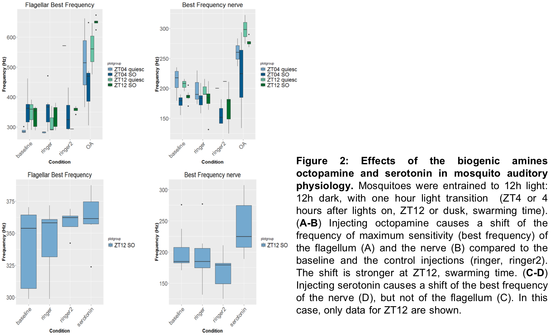 During the first six months, we performed RNA-Seq analysis of mosquito ears and heads in male and female mosquitoes at six different circadian time points along the day (one of them coinciding with the circadian time point when mosquitoes swarm). We wanted to investigate how the patterns of expression of octopamine and serotonin receptors change along the day. In malaria mosquitoes, swarming behaviour occurs only at sunset. I expected a link between the action of octopamine and serotonin in modulating mosquito hearing and the acoustic interactions that take place within the swarm. This should be reflected in the temporal pattern of receptor expression. Our results show that two octopamine and two serotonin receptors are expressed in the mosquito ear and their expression is temporally modulated. Interestingly, one octopamine receptor shows a peak of expression at swarming time. By contrast, the expression of one serotonin receptor is lowest during swarming (Fig. 1). These results suggest octopamine and serotonin as putative candidates for modulating mosquito acoustic communication during swarming.