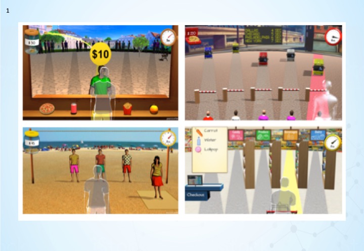 1. Movement induced cognitive training. I showed the feasibility, acceptability, and initial efficacy of a novel gamified movement-induced cognitive-training platform, the Functional Brain Trainer by Intendu (Figure 1): (1) Healthy adults benefit more from combined cognitive-control training and physical activity than from the same cognitive training lacking an active physical component. (2) People suffering from stroke or traumatic brain injury reported enjoyment and satisfaction from training with the platform in clinical / community settings, managed to perform increasingly more challenging cognitive tasks within game environments, and preliminary results showed improvements in functional tasks following training (published as a conference proceeding paper; Shochat, Maoz, Stark-Inbar, et al. Proc IEEE (2017). DOI: 10.1109/ICVR.2017.8007530.).