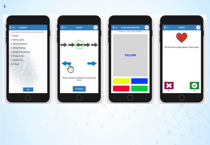3. Smartphone deployed cognitive battery. A major project I led in Montfort, is the development and initial validation of a cognitive battery, including digital versions of existing and accepted cognitive tests to assess memory, attention, inhibition. (Figure 3). Initial results from healthy individuals (5-90 years of age) who successfully completed our smartphone version of one attentional test - Flankers, show that adults are significantly faster than children and elders in responding to stimuli. While all age groups suffer from the expected perceptual cost when a central target is “flankered” by incompatible distractors, this cost is significantly larger in children.