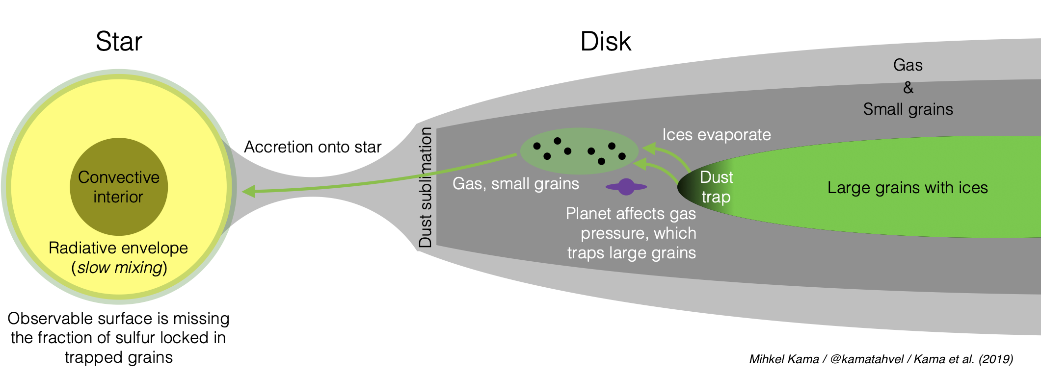 The major published outcomes of DISCO include the innovative CAM-technique for measuring the chemical element content of planet-forming material (Jermyn & Kama 2018; see also the illustration); its application to first measurement of the content of sulfur, zinc, and sodium in planet-forming rocks (Kama et al. 2019); and new gas mass constraints for 15 protoplanetary disks (Kama et al. submitted). In addition to this, contributions were made to several other papers, and new work on the carbon-to-oxygen ratio and other elemental abundances in disks is being prepared for publication, including several projects where summer and Master's students made significant contributions. Work done in the DISCO project is substantially feeding into the science consortium activities of the European Space Agency's ARIEL space telescope, where it is being well received by the exoplanet research community.