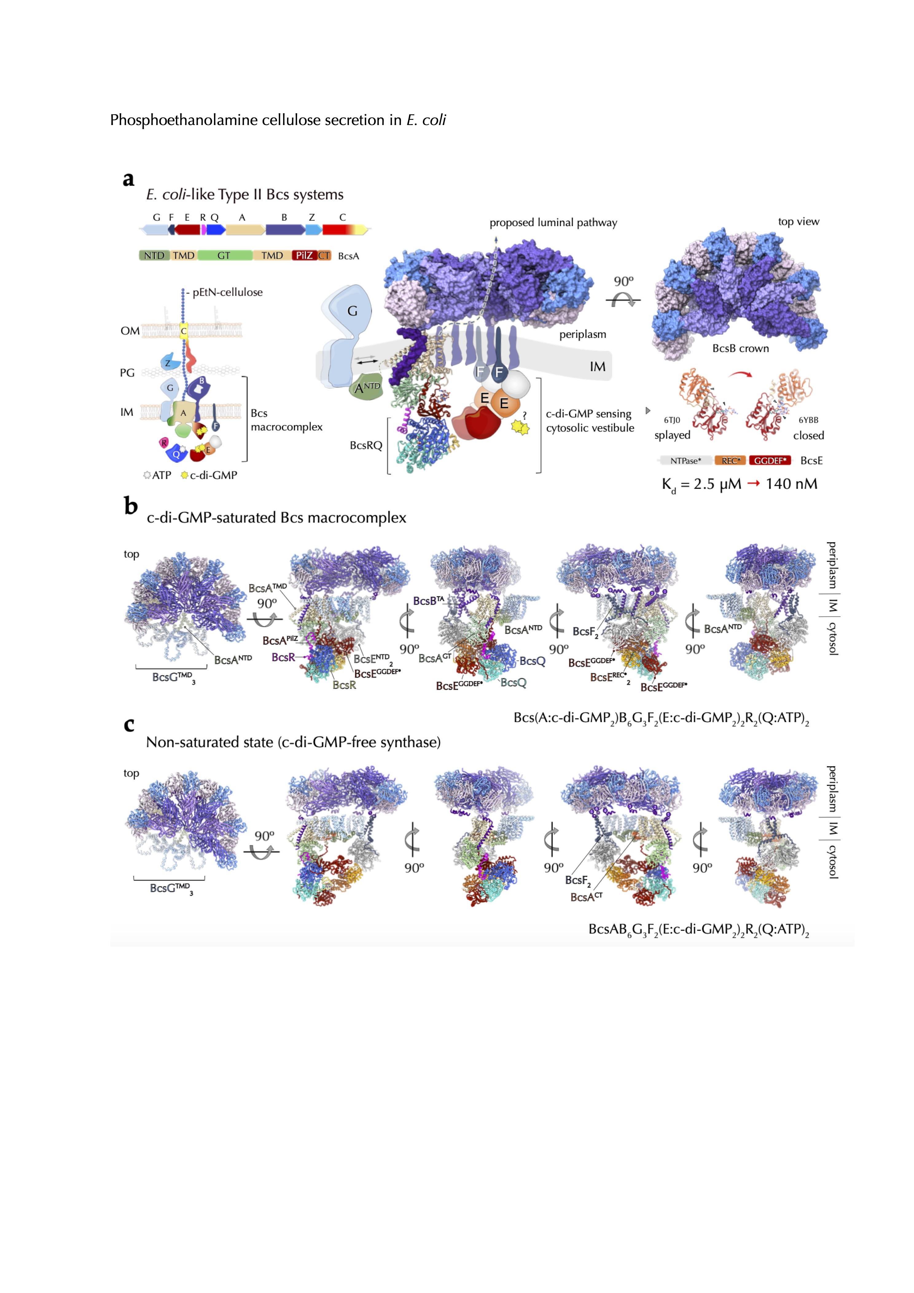 In our seminal 2017 study (Krasteva et al. 2017), we showed that in Escherichia coli, the BcsAB cellulose synthase tandem assembles into a stable megadalton-sized macrocomplex with multiple accessory subunits. In recent works (Zouhir et al. 2020, Abidi et al. 2021 and Anso et al. 2024), we presented high-resolution cryo-EM structures of the assembled Bcs secretion macrocomplex and sub-assemblies, as well as multiple crystallographic structures of individual Bcs subunits and/or multi-component complexes. We demonstrated that the E. coli Bcs macrocomplex features an unexpected subunit stoichiometry, which begs a rethinking of the generally accepted model for equimolar BcsAB synthase assemblies throughout the bacterial domain of life. In it, the essential for secretion BcsRQ appears to play essential roles in both ATP-dependent membrane targeting of the synthase and in its post-translational catalytic activation. We also showed an unexpected mechanism for asymmetric secretion system assembly via superhelical periplasmic BcsB oligomerization, which is likely conserved among enterobacteria. We further revealed that enterobacterial BcsA has evolved an additional N-terminal domain that recruits three copies of the phosphoethanolamine-transferase BcsG for efficient polymer modification. We also demonstrated that enterobacterial BcsE packs a subtle but diverse toolkit to fine-tune cellulose production and provided structural and functional data that support multidomain evolution, fold conservation and synthase-activating, intercalated c-di-GMP complexation on one hand, together with BcsRQ recruitment and membrane targeting through BcsF interactions on the other. We further showed that through discrete conformations and dimerization interfaces BcsE then acts as a high-affinity c-di-GMP sensor that recruits the synthase-activating BcsRQ tandem even in the absence of direct dinucleotide-synthase interactions. Together, these results can explain cellulose secretion initiation in diverse layers of the mature biofilm architecture.