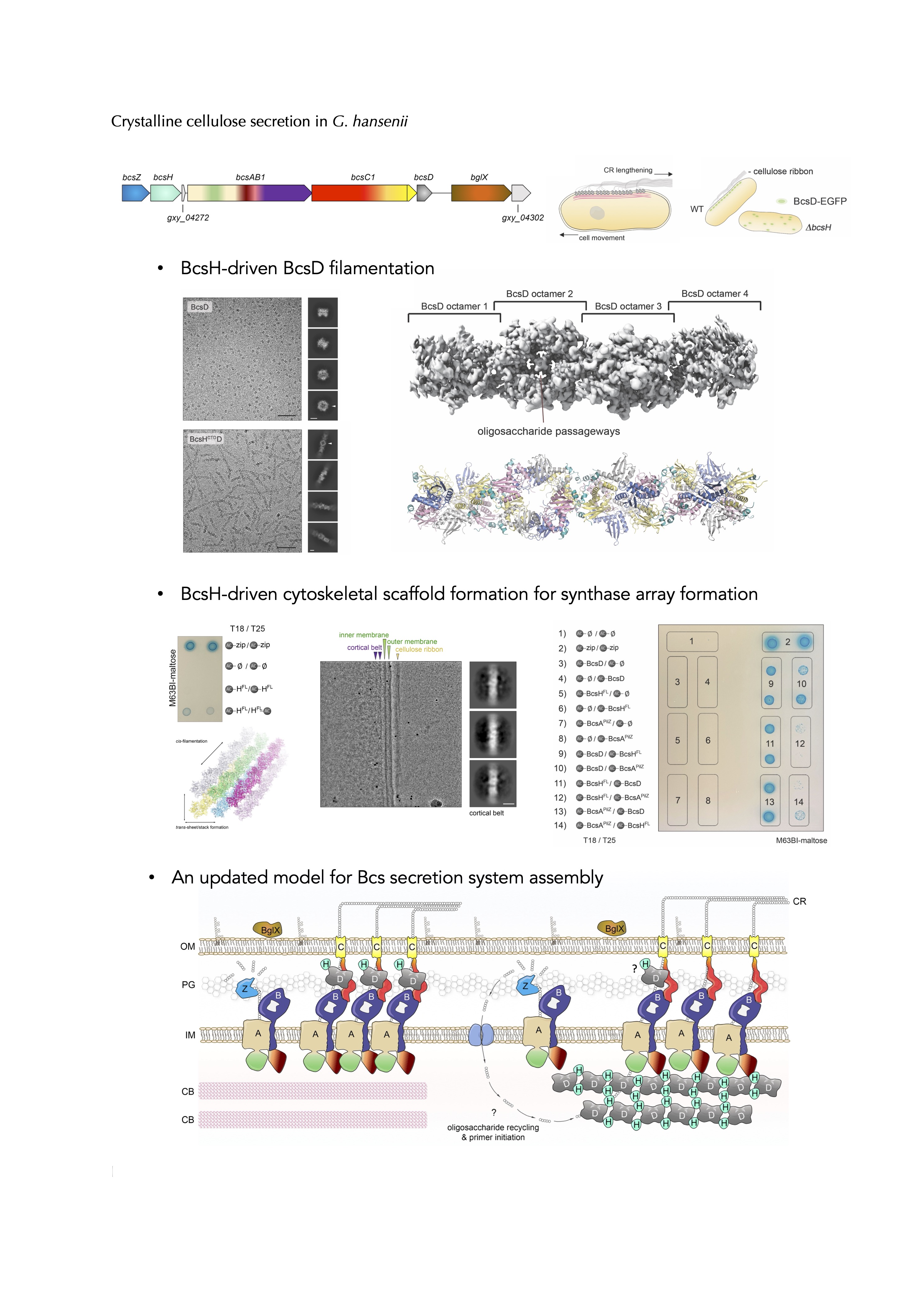 Despite strong conservation of the BcsAB tandem, in the economically relevant cellulose superproducer G. hansenii cellulose is secreted in a drastically different manner: a longitudinal nanoarray of synthase terminal complexes (TCs) assembles the EPS into a crystalline cellulose ribbon with implications in cell motility, flotation and substrate colonization. Crystalline BC secretion is dependent on two accessory subunits earlier proposed to interact in the periplasm, BcsD and BcsH. We recently provided the first atomic-resolution insights into BcsHD mediated BC crystallinity: proline-rich BcsH drives BcsD oligomerization into a three-dimensional supramolecular scaffold. We showed that, in situ, the BcsHD assemblies share remarkable morphological similarities with the recently discovered cortical belt, namely an intracellular cytoskeleton that spatially correlates with the cellulose exit sites and the assembled crystalline cellulose ribbon. Finally, we detected specific protein-protein interactions between the BcsHD components and the regulatory BcsAPilZ module, further supporting that BcsHD features an unexpected intracellular localization for inside-out control of TC array formation and crystalline cellulose secretion (Abidi et al. 2022).