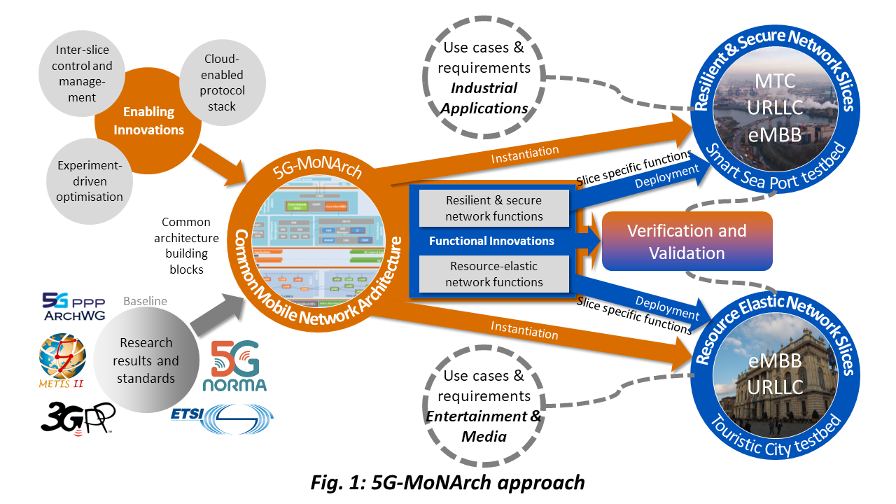 These challenges have been addressed by 5G-MoNArch, through its ultimate goal to create a 5G system that is actually usable in practice and proving its feasibility and applicability in real-world environments. The objectives have thereby been to: i) provide a detailed and fully-fledged 5G mobile network architecture design together with key innovations enabling the operation of 5G network slicing (i.e. logical isolated network sharing a common infrastructure); ii) develop features required to implement two verticals-defined use cases (industrial and M&E); iii) deploy and implement the architecture, use cases, innovations and technologies in real-world testbeds; and to iv) evaluate, verify and validate the developed solutions on their technical and economic performance. The overall project approach is shown in Fig. 1.