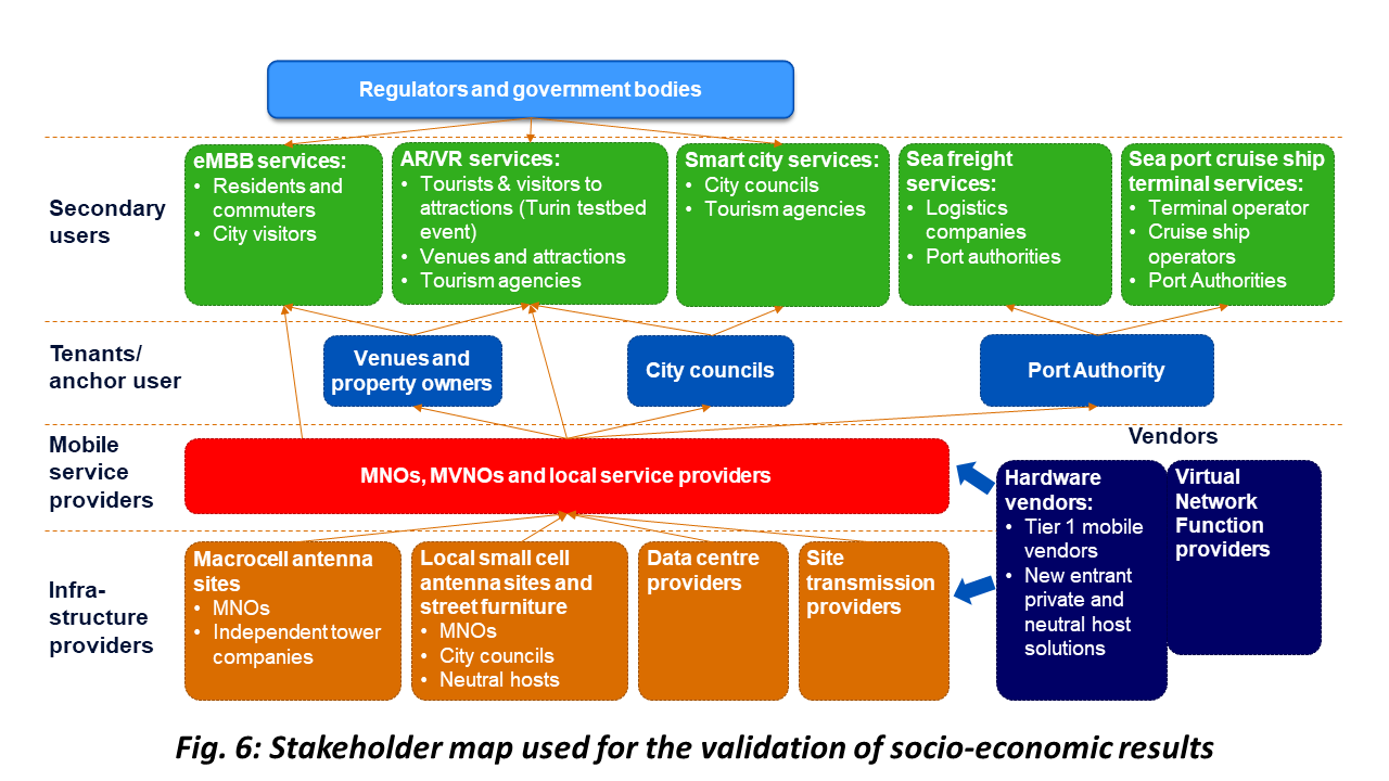 Third key result has been the successful verification and validation of the architecture, use cases and features, conducted through: i) implementing the two real-world testbeds; ii) verification of technical KPIs through network-level simulations (Fig. 5) allowing a wider deployment than the testbeds; iii) analytics tool-supported techno-economic verification of the results based on three evaluation cases, pointing out the commercial advantages and opportunities of the 5G-MoNArch technologies; and iv) validation of the results through direct interaction with 5G stakeholders (Fig. 6).