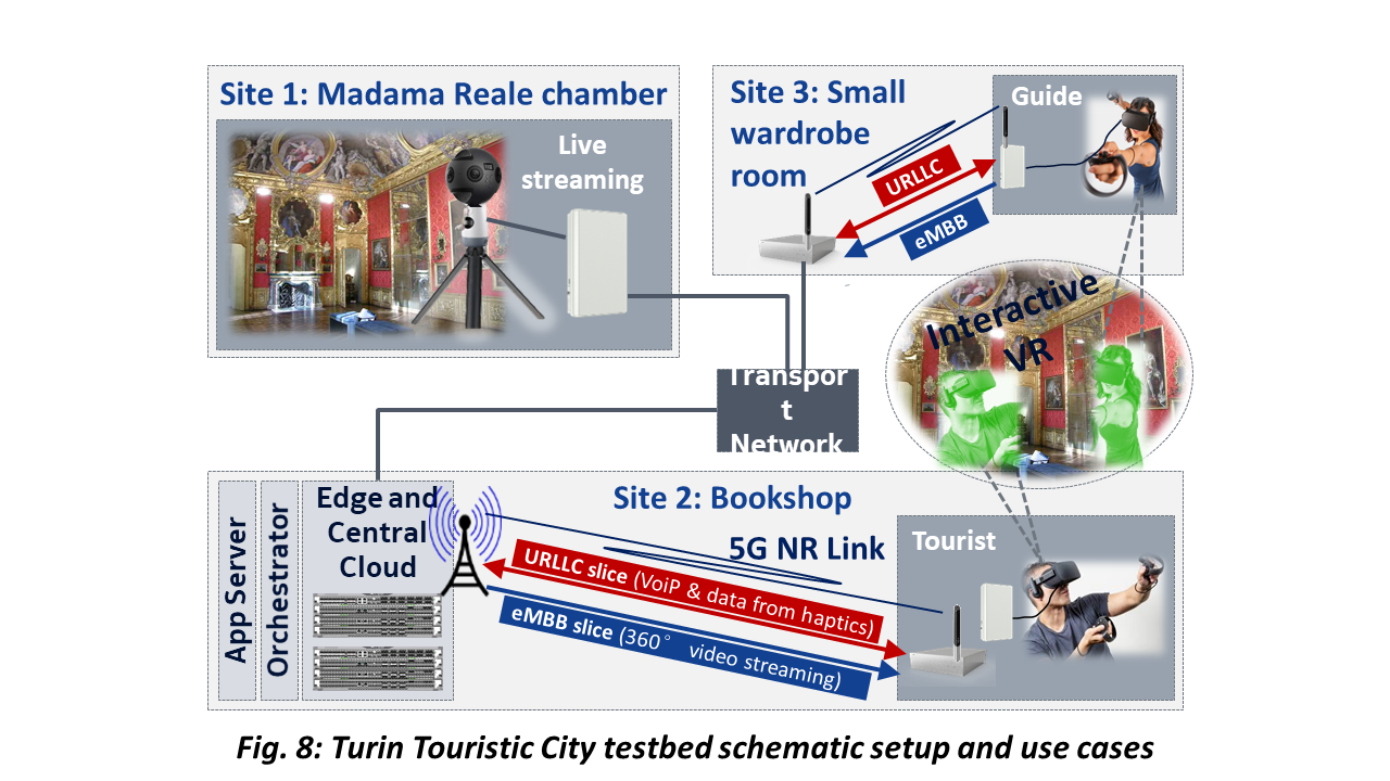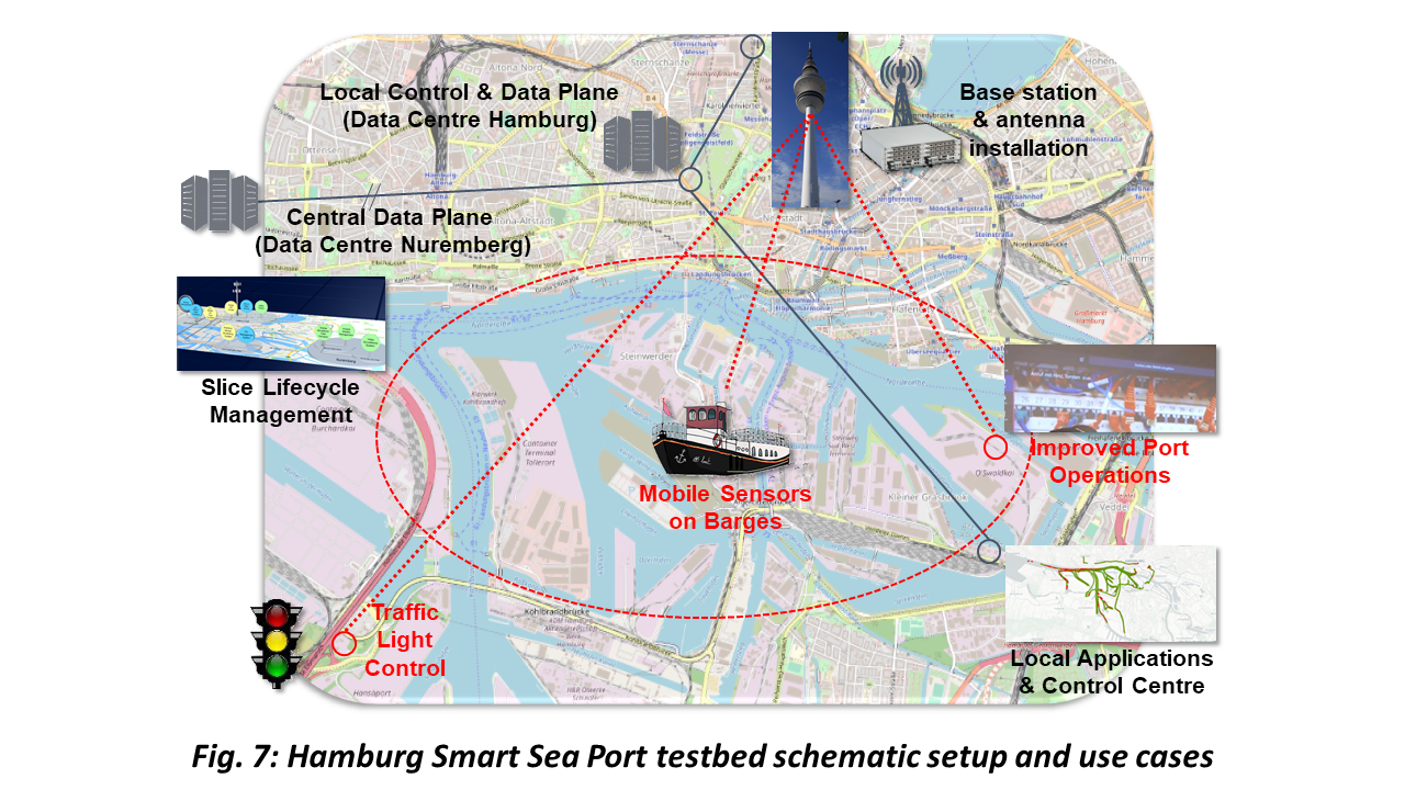 The Smart Sea Port testbed (Fig. 7) in Hamburg has implemented three slices for industrial applications: a traffic light control (reliable and secure), mobile air quality sensors on barges (reliable machine type communication), and augmented reality for port operations (latency-critical mobile broadband). The Touristic City testbed (Fig. 8) has implemented two slices for M&E applications: a 360° live video stream transmission (enhanced mobile broadband) and a real-time multi-user interaction (ultra-reliable reliable low latency). Both testbeds have been implemented by operators using pre-commercial vendor equipment and have been integrated with the vertical’s operation (Hamburg) or involved real end users (Turin).