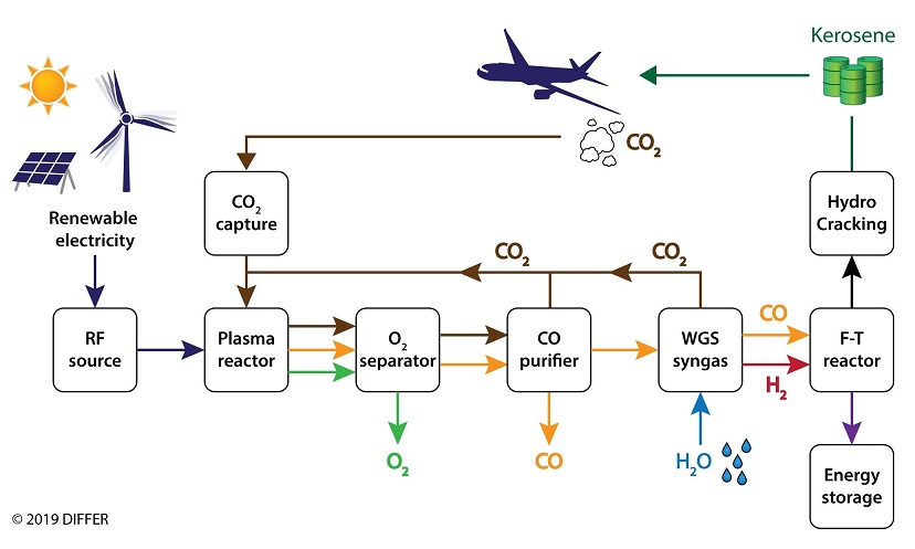 The KEROGREEN approach is uniquely based on plasma-driven dissociation of air-captured CO2, oxygen separation by high temperature oxygen conducting membranes and advanced Fischer-Tropsch (FT) synthesis to yield kerosene. Synergy between plasma-activated species and novel perovskite electrodes of the oxygen separator is shown to raise CO productivity, a valuable intermediate product. High heat transfer FT technology results in process intensification, producing long chain hydrocarbons at extended catalyst life time. Hydrocracking (HC) upgrades the FT wax to sustainable aviation fuel (SAF) compatible with current aircraft technology.