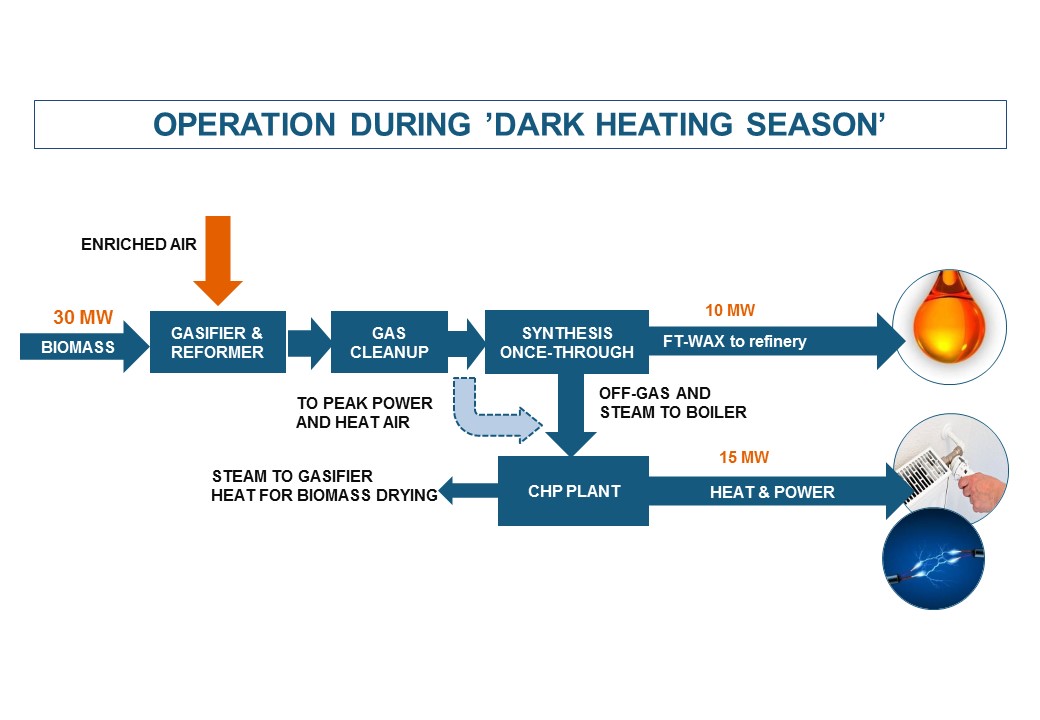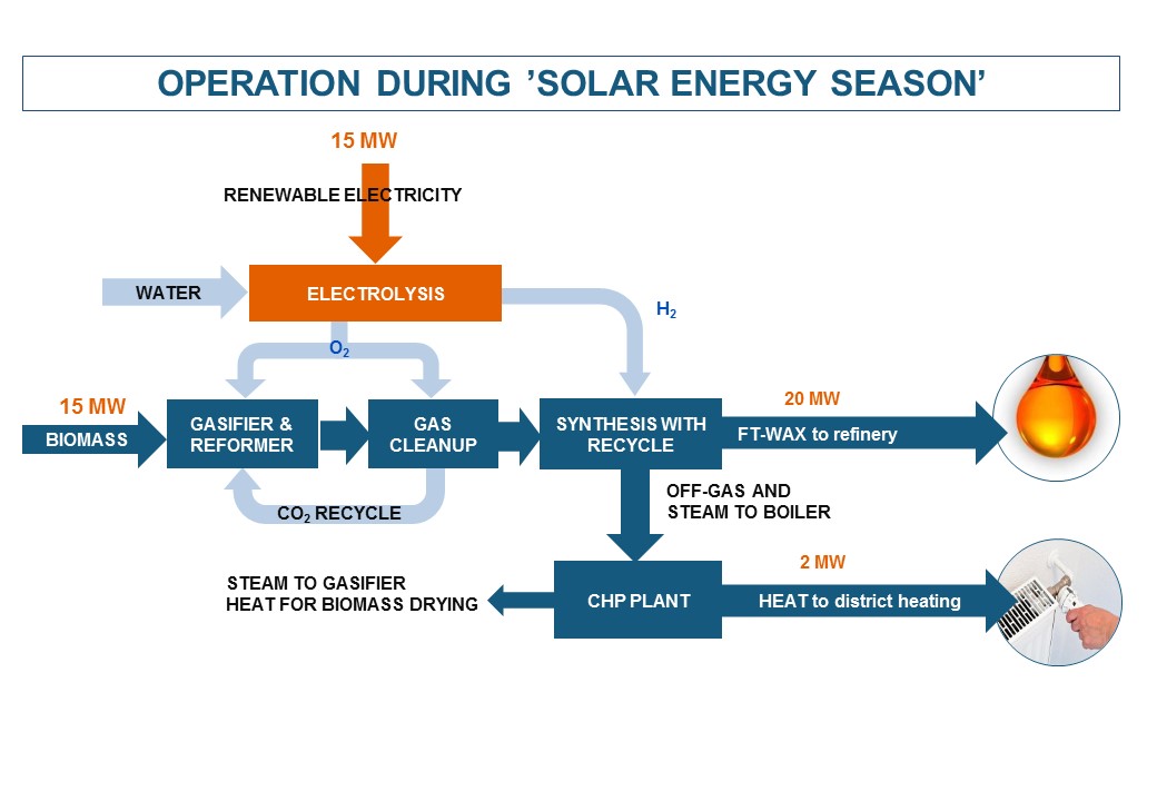 • The main novel approach of FLEXCHX is the method for operating the plant flexibly under different operating modes, either maximizing the production of transport fuel intermediate (solar season) or maximizing the overall efficiency to power, heat and fuel component (heating season).
