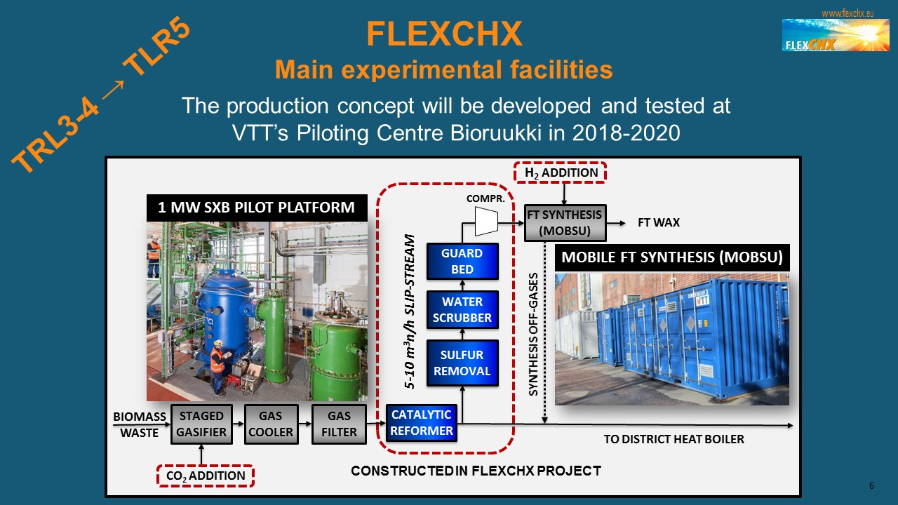 The overall goal of FLEXCHX was to develop a flexible energy production process that can be operated in the future European energy mix throughout the year with high efficiency and low cost. The aim was to develop all key enabling technologies of the process, the gasifier, hot filter, catalytic reformer, sorbent-based final gas cleaning, and the flexible and compact FT synthesis to TRL5 and to validate the operation at pilot-scale tests.