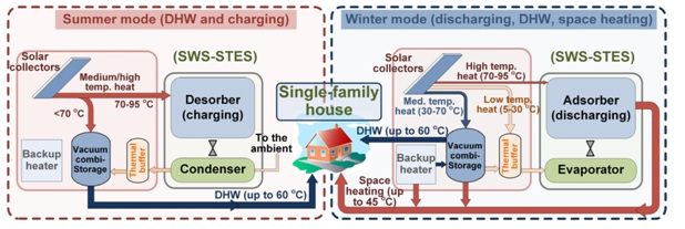 The project concept is to develop an innovative Seasonal Thermal Energy Storage (STES) unit with a novel Selective-Water-Sorbent (SWS) heat storage material embedded in a compact STES unit. This will allow us to store and shift the harvested solar energy available abundantly during the summer to the less sunny and colder winter period thus covering a large fraction of thermal demand in buildings. Solar heat is used to provide hot water up to 60°C for space heating and domestic hot water, while the remainder will be used mainly to charge the seasonal storage unit during summer, allowing to store the heat for several months. During winter, the stored heat is discharged, and a backup gas heater will operate only when all stored heat has been fully discharged. By making use of even the lowest grade solar heat (within 5 – 30°C), the system allows to reach solar fraction currently not achievable at reasonable price and small space demands (e.g. with solar collectors and water-based Thermal Energy Storage). The detailed concept is presented in Figure 1, based on its two main operating modes (summer/winter).