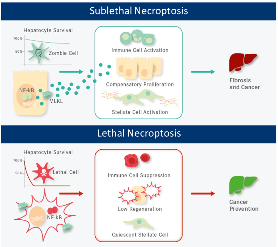 Using genetic mouse models and newly developed real-time imaging techniques, we were able to observe how necroptosis unfolds in a living organism. We discovered that there is a sublethal or "zombie" state of necroptosis, where cells are damaged but do not fully die. This partial cell death leads to the release of inflammatory signals that can promote liver inflammation and cancer. Whether this process is harmful or protective depends on other molecular pathways activated at the same time — especially a key inflammation regulator known as NF-kappaB. This means necroptosis can either worsen disease or help fight it, depending on the context.