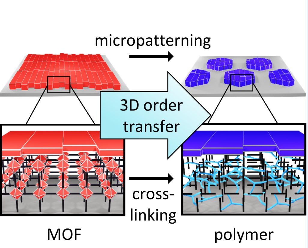 WP3: Control – We developed protocols for the controlled fabrication of high-quality heteroepitaxially oriented MOF films (see WP1) and high-quailty micropatterns. We developed the fabrication of micropatterns of 3D oriented Cu2(L)2DABCO MOF films by using X-ray sensitive organic linkers (L= Br2BDC). Further, using azide-functionalized linkers, we were able to obtain oriented porous polymer (CL-POL) micropatterns starting from the MOF Cu2(N3BPDC)2DABCO by X-ray lithography. These CL-POL micropatterns preserve the original orientation, with the advantage of superior chemical and structural stability.