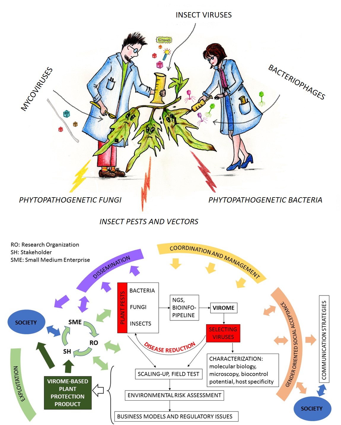 In summary, VIROPLANT was able to identify and characterize molecularly a large number of new viruses infecting bacteria, fungi and insects. Some of them were characterized also biologically, and their potential for biocontrol was evaluated. Some encouraging results were obtained specifically for the bacteriophages to be used for control of bacterial plant diseases. Virus-induced gene silencing (VIGS) approaches did not result in feasible biocontrol tools, both for technical and regulatory reasons. A potential market and communication strategy to overcome reluctance to adopt virus-based biocontrol agents were identified. The regulatory burden together with low social acceptability remains a major hurdle to develop further steps.