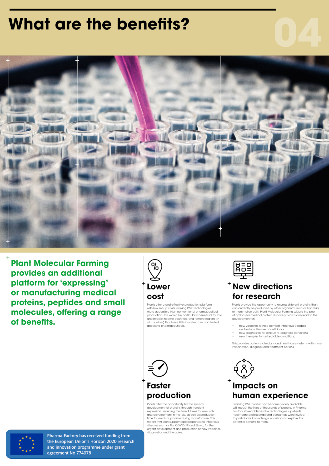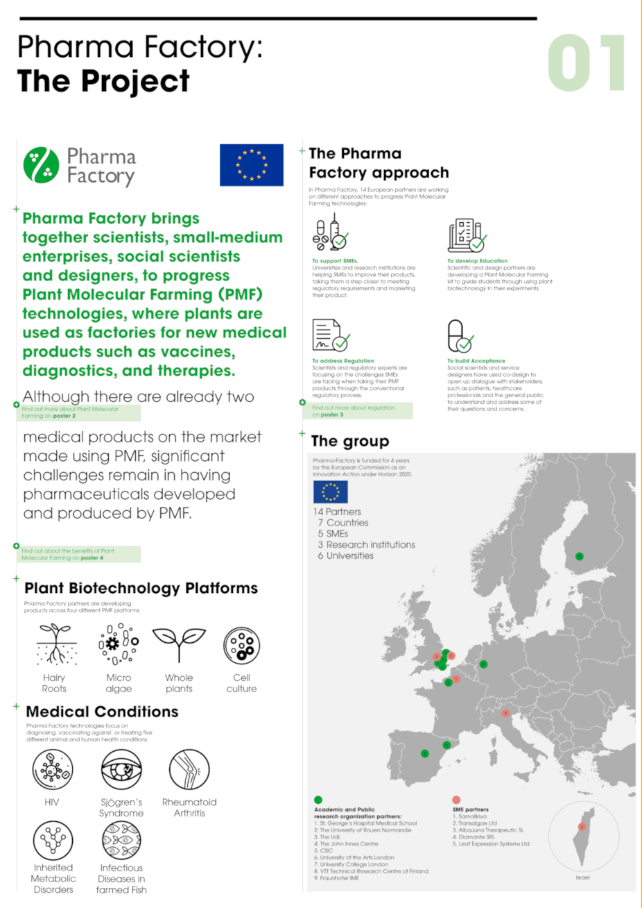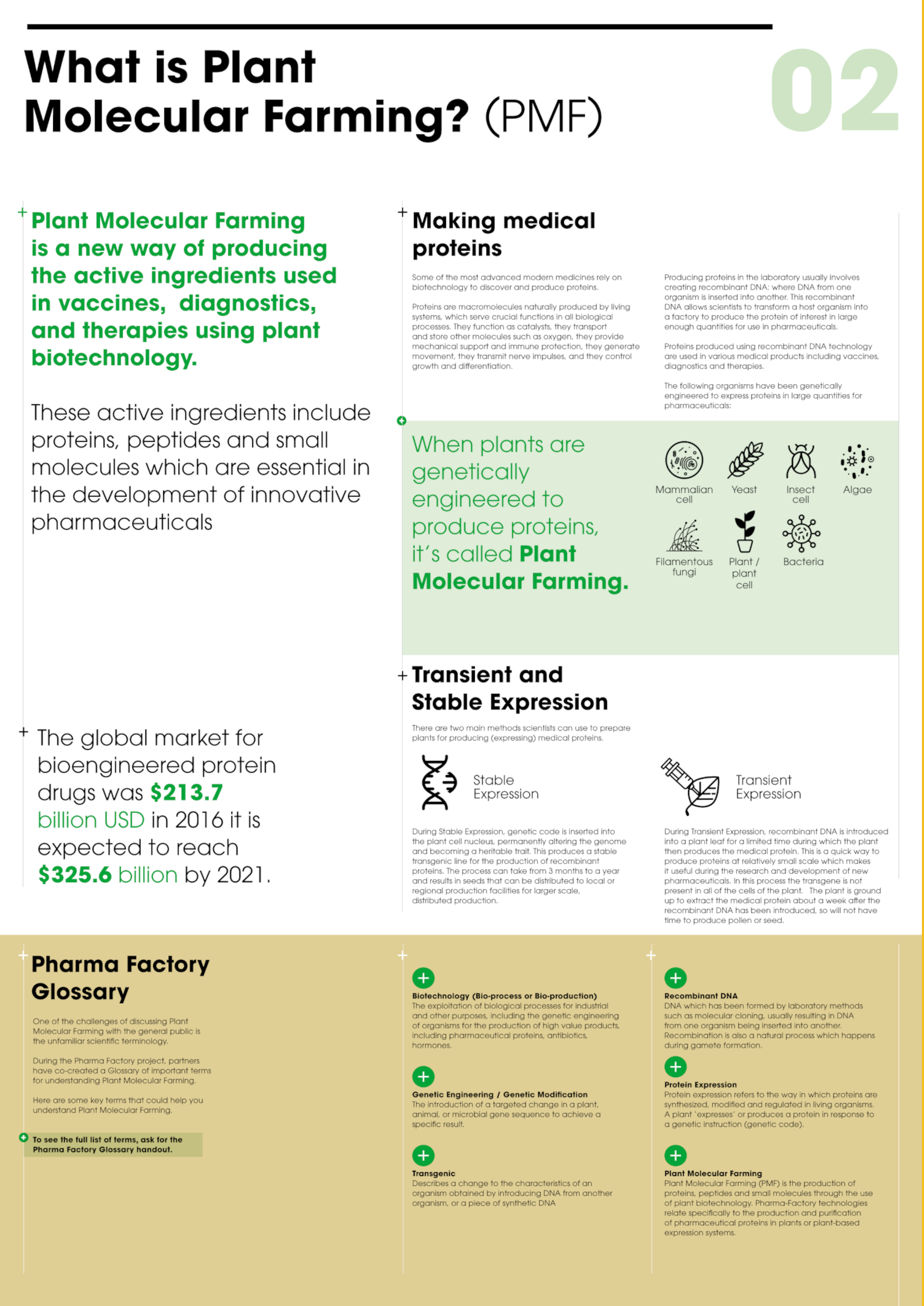 Plant Molecular Farming is the production of high-value compounds from plants through the use of biotechnology. High-value compounds in this project are biologics as human and animal medicines and high quality recombinant proteins for use as reagents, diagnostics and in biomedical research. The overarching aim of Pharma-Factory was to drive new and innovative recombinant products towards the market. This was achieved through the refinement and demonstration of plant platforms as manufacturing systems that compete with and complement existing and conventional microbial or animal-based systems, as well as a concerted effort to address regulatory issues and understand the wider perception of PMF technologies. To emphasise the key roles of small companies in Pharma-Factory and to ensure translational focus, companies led our efforts on product development.
