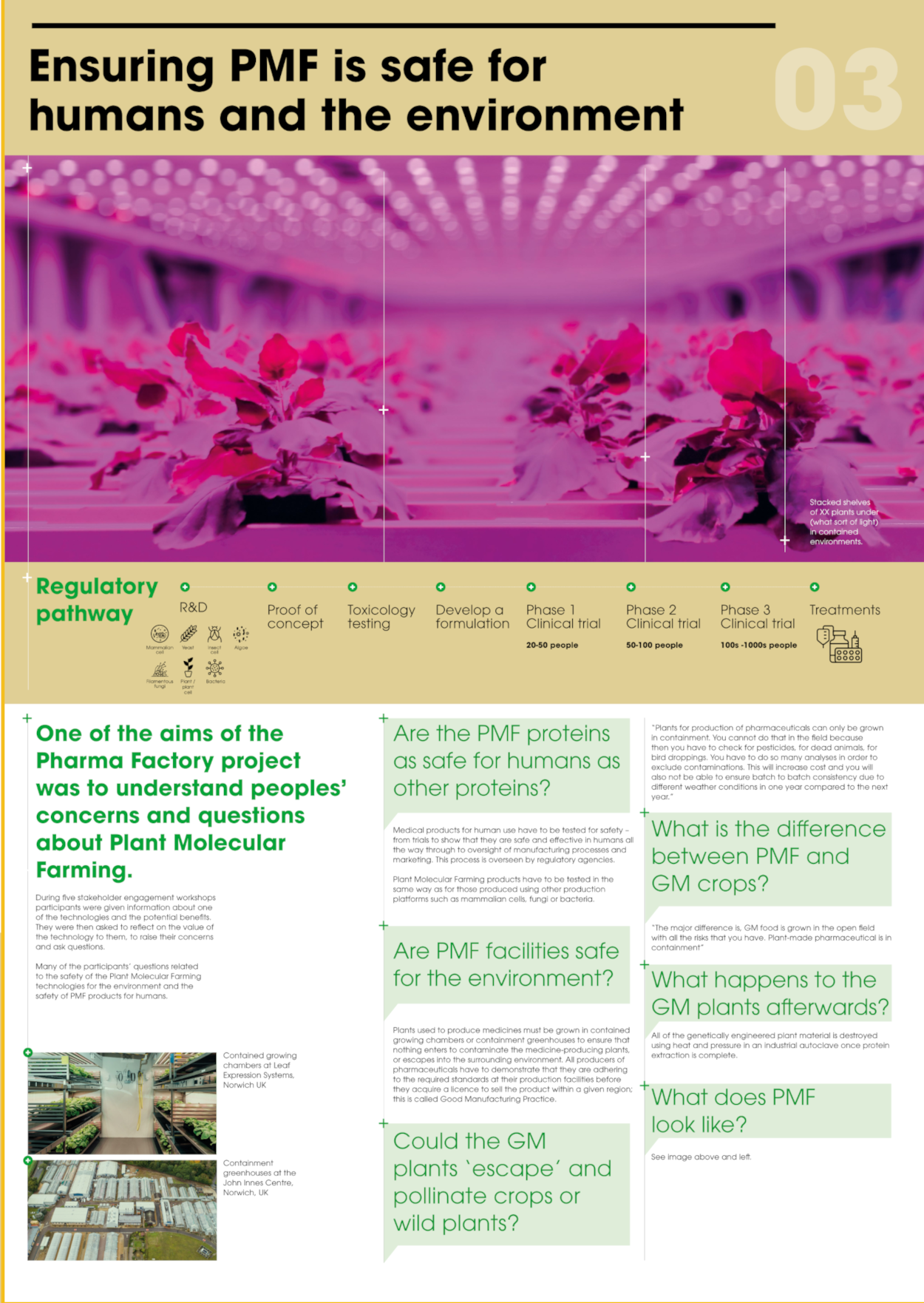 Whilst the public may appear to hold strong views on GM technologies in plants, when it comes to Plant Molecular Farming, they are generally unfamiliar or at worst agnostic about the technology, but inclined to be favourable towards GM applications that offer true medical benefits. Whilst this may appear to be a good position, a pro-active approach is the most likely to result in the most favourable outcomes. Drawing together industry and academic stakeholders, we introduced and explained Plant Molecular Farming to a range of end users across European regions, identifying barriers to acceptance and developing new novel approaches to lowering these barriers.