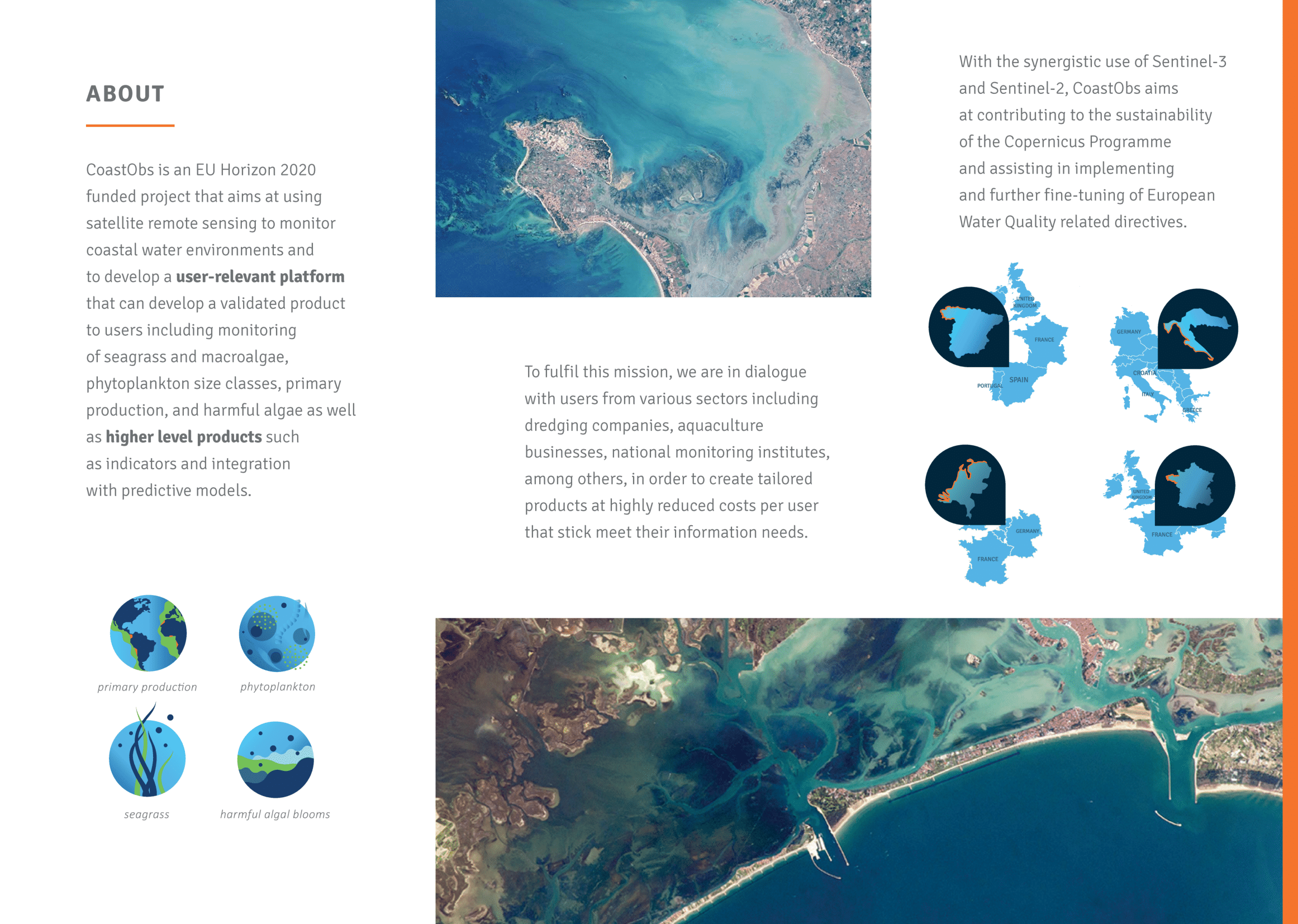The overall objective of CoastObs is to develop a commercial downstream service platform for monitoring and reporting of coastal water quality based on Earth observation. Work is ongoing to develop and validate innovative EO-based products based mainly on Sentinel-2 and Sentinel-3: monitoring of sublittoral habitats and intertidal areas, phytoplankton size classes, primary production, and detection of harmful algae. A particular focus of the project lies on turning the satellite-derived geophysical data layers into higher-level information products that satisfy the users’ information needs, such as trend analysis, indicators for environmental reporting or integration with predictive models. To ensure that the products developed are of added value to the users, CoastObs is working closely with public and private organisations from various sectors (water management authorities, aquaculture producers and organisations, port authorities). CoastObs is establishing sustainable supply chains that can be directly integrated into the users’ systems.