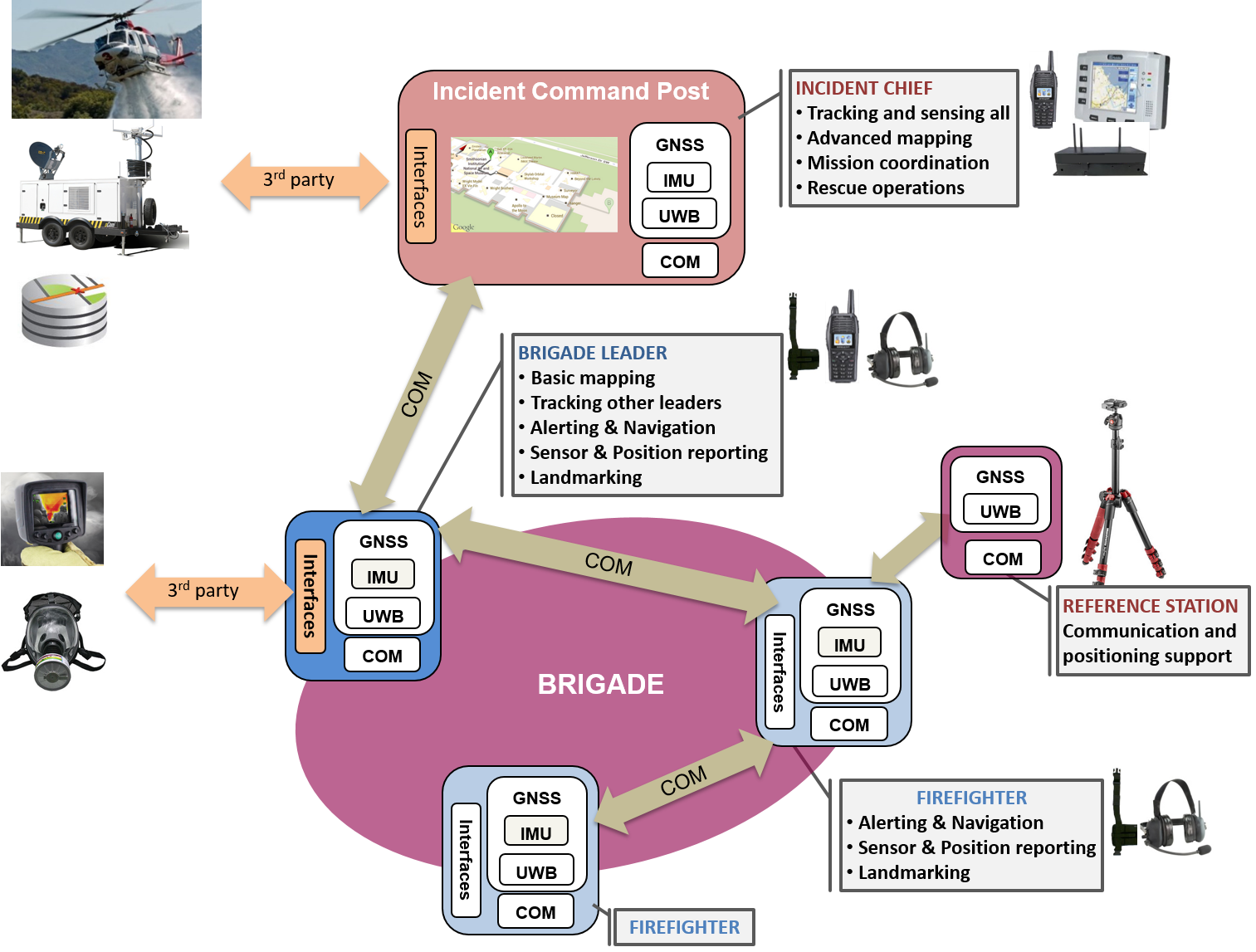 It is composed of one node per person, 1 communication gateway per brigade, 1 tablet per brigade for the mobile application and 1 ICP application for the command post. The nodes have EGNSS, IMU Pedestrian Dear Reckoning and UWB inter-distance sensor with no fixed infrastructure deployed for them. This system is completed with a very innovative fusion algorithm for the estimation of the position of every node with no need to know the buildings in advance.