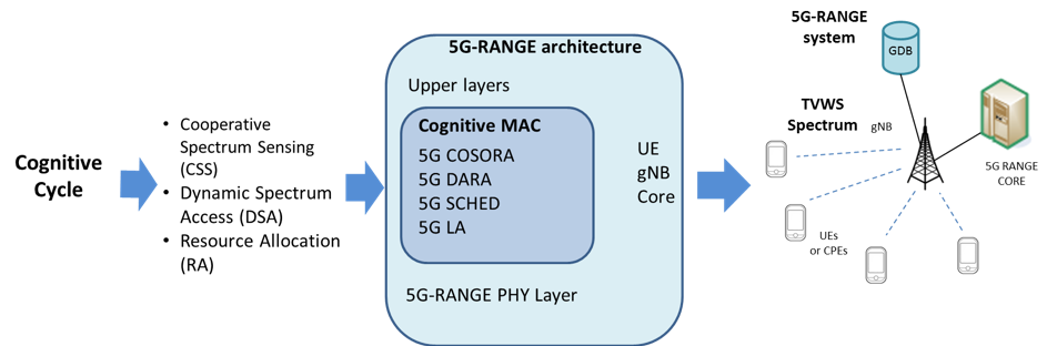 A cognitive media access control (CMAC) that is responsible for the opportunistic spectrum allocation. Different spectrum sensing techniques are integrated with collaborative sensing. The base station is responsible for fusing the spectrum sensing report from all users into a global decision. The 5G-RANGE solution proposes the introduction of the cognition, with the use of Cognitive Cycle integrated into the Medium Access Control layer to implement Cooperative Spectrum Sensing and Dynamic Spectrum Access. The general architecture of the Cognitive MAC layer integrates multiple blocks related with cognition: 5G-COSORA; 5G-DARA; 5G-SCHED; and 5G-LA.