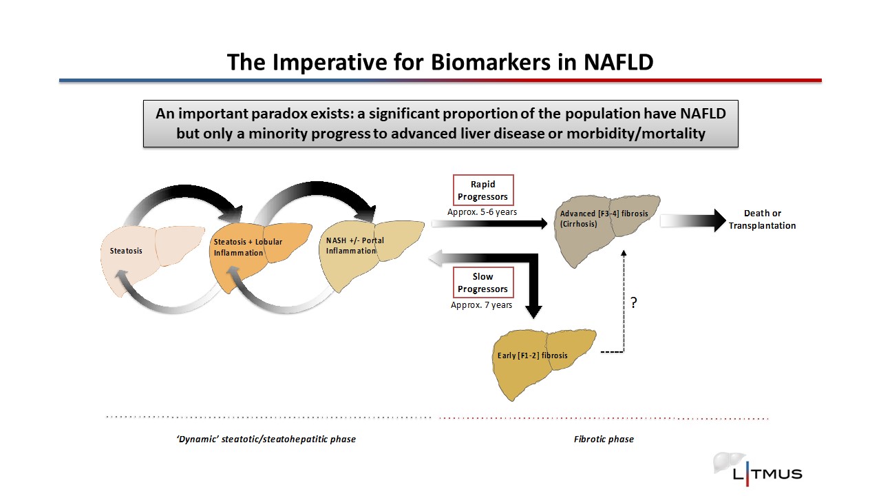 The transition from MASL to MASH and the stage of fibrosis are important discriminators between a relatively benign prognosis and an increased risk of morbidity/mortality. Liver biopsy remains the established but imperfect ‘gold standard’ investigation, being invasive, resource intensive, prone to sampling error and carrying a small but significant risk of complications. Such invasive tests are not practical outside specialist practice and are particularly unsuitable with such a large ‘at risk’ population. A lack of tractable non-invasive biomarkers has impeded the diagnosis, risk stratification and monitoring of patients. It has also hampered drug development and the conduct of clinical trials, which still depend on histological effect as an endpoint. The overarching aim of LITMUS was to develop, robustly validate and advance towards regulatory qualification biomarkers that diagnose, risk stratify and/or monitor MASLD/MASH progression and fibrosis stage. Success will help target care to those at greatest risk, and ultimately facilitate drug development and novel treatments.