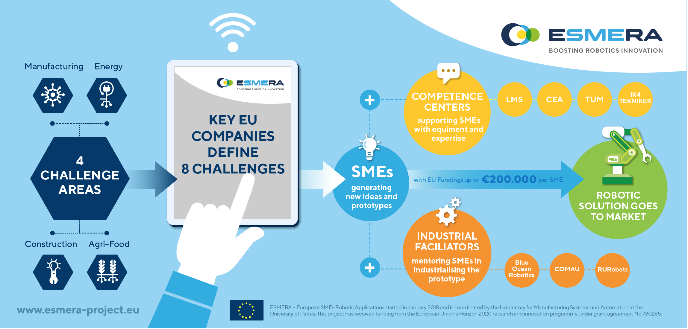 ESMERA aims to support SMEs in the realisation, testing and promotion of robotic technologies through: