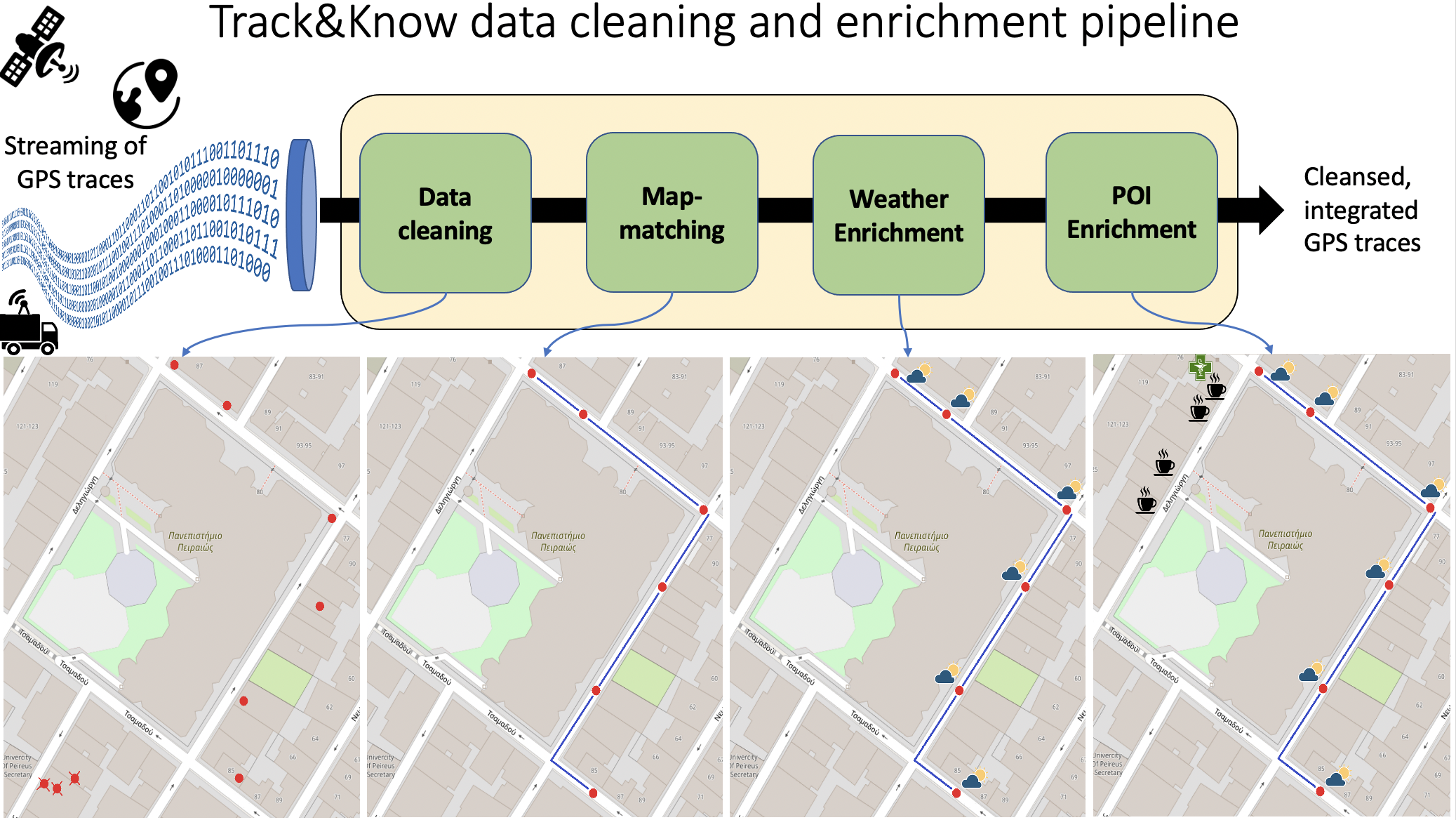 -Data Cleaning, map matching and Enrichment Pipeline – integrated into the Track&Know platform to pre-process at scale large amounts of data and augment with POI, Weather, and Map data