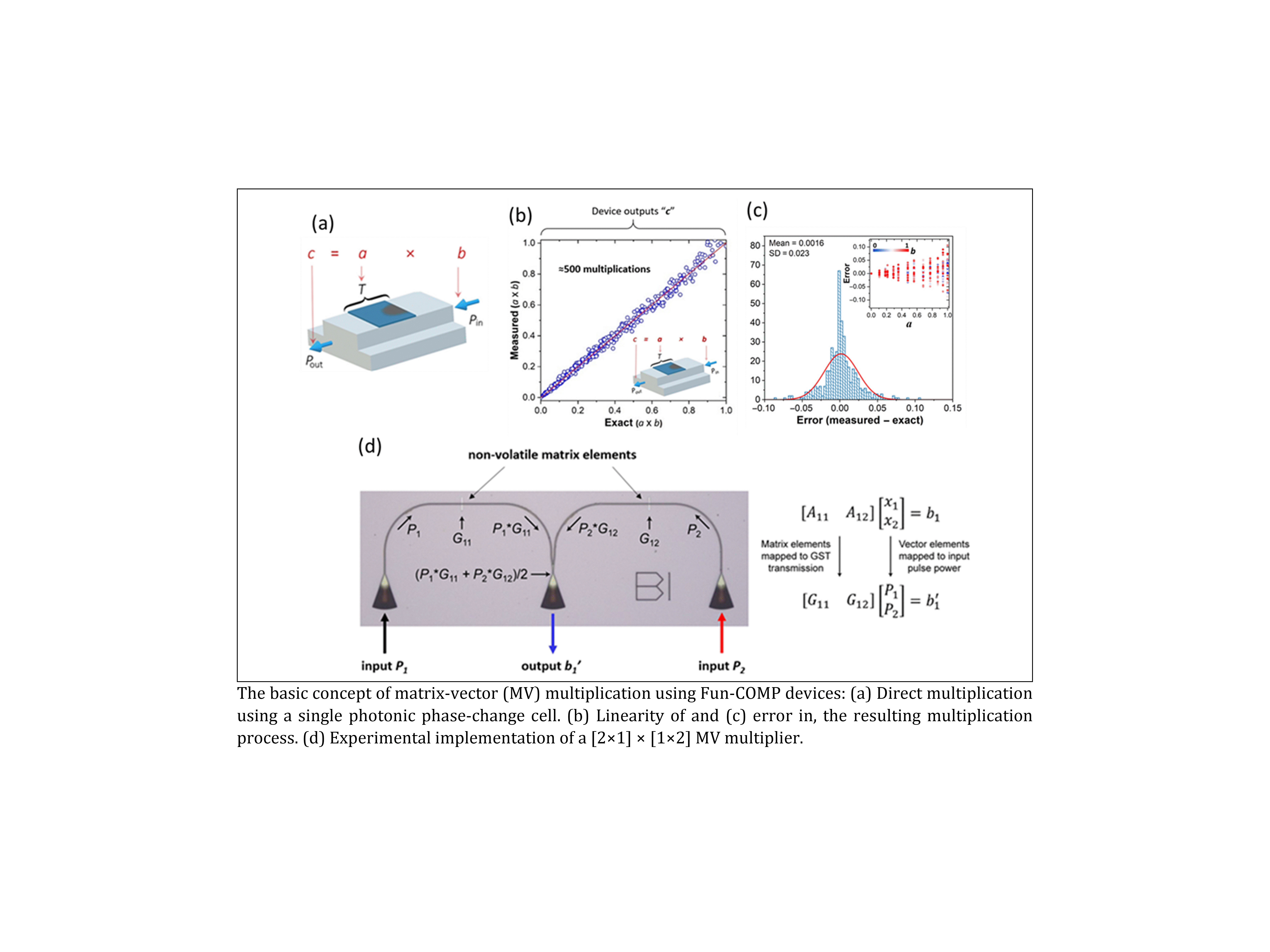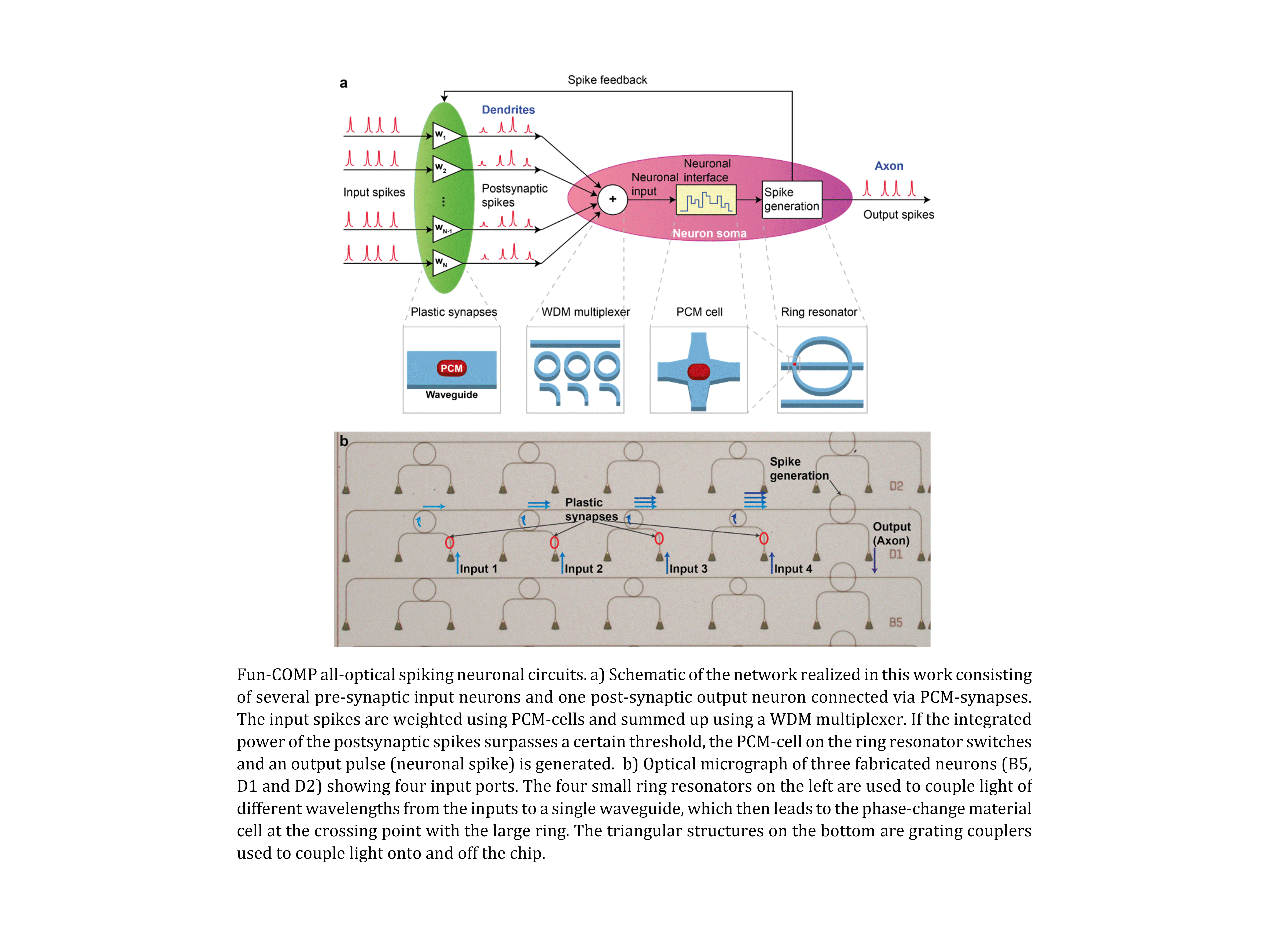 • We have combined Fun-COMP devices (or computing primitives) to deliver (i) small-scale all-optical memory chips , (ii) small-scale all-optical neuromorphic processing chips, (iii) photonic arrays suited to carrying out arithmetic processing (specifically matrix-vector multiplication), (iv) temporal correlation processors, (v) memory-enhanced photonic reservoir computing networks
