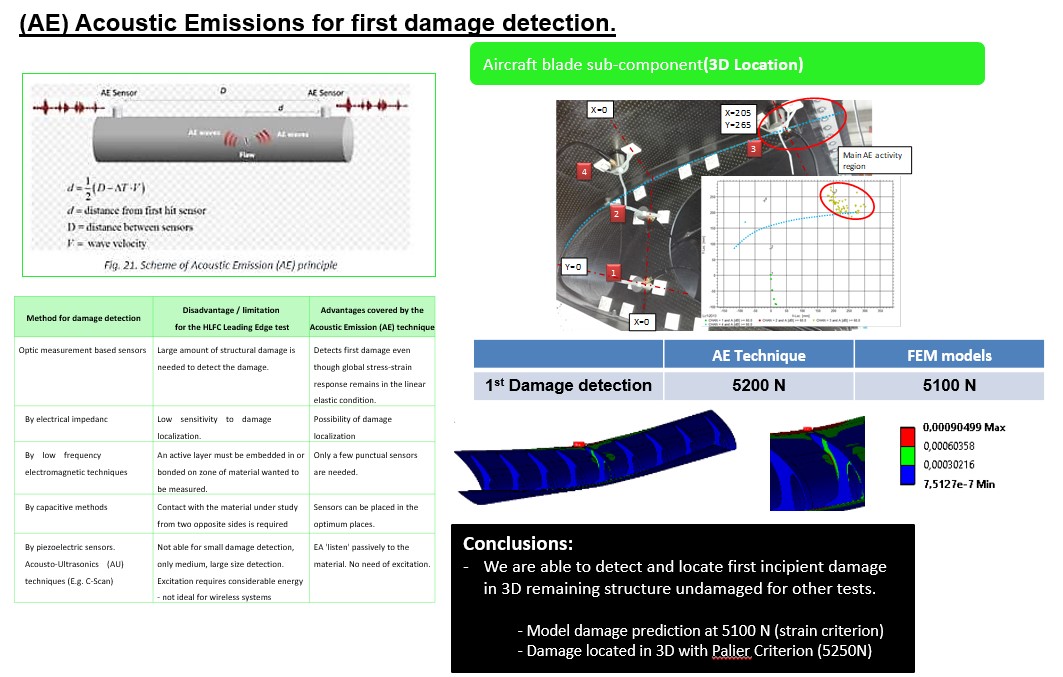 (AE) Acoustic Emissions for first damage detection has been considered the SHM technology that during the project has shown a beyond state of the art development. We can detect and locate first incipient damage in a real 3D representative structure. Procedure developed match very well with FEM model with strain criteria implemented. After the damage location, the component remains undamaged and is ready to be used for other tests, reducing the number of complex and cost final components.