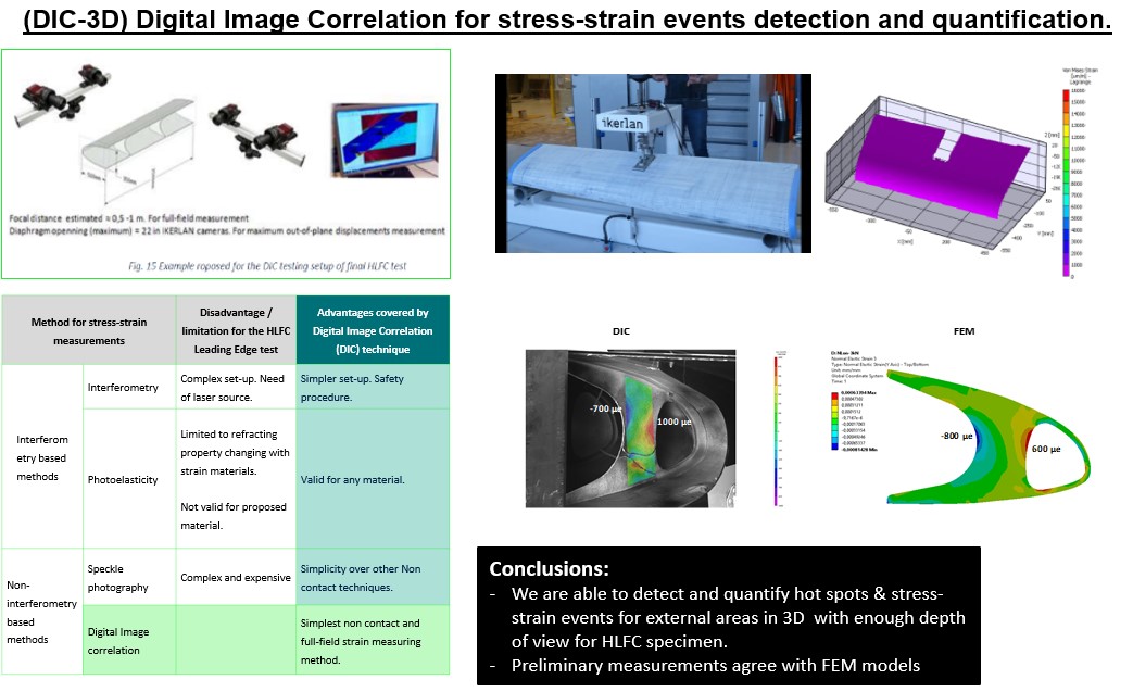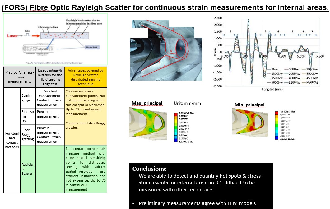 We also have tuned up the innovative SHM systems of (DIC-3D) Digital Image Correlation and (FORS) Fibre Optic Rayleigh Scatter techniques for the stress-strain events detection and quantification during experimental test. More concretely it has been tuned up the DIC system in order to detect and quantify hot spots & stress-strain events for external areas during tests of 3D specimens close to final one to be tested. The set-up has been developed specially for high depth of fields necessary for industrial components when they are tested. On the other hand, it has been tuned up the FORS technology for continuous strain measurements for internal areas. We can detect and quantify hot spots & stress-strain events for internal areas in 3D components difficult to be measured with other techniques.