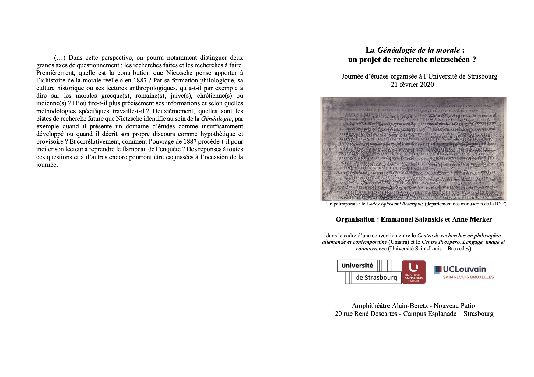 • A second line of research consisted in transforming the French genealogical turn and its Anglophone posterities into a genealogical object per se, in order to trace the emergence and diversification of this new kind of appropriations of Nietzsche. My Belgian colleague Quentin Landenne and I have begun this work at the Université Saint-Louis – Bruxelles, by organizing in April 2021 an international conference on "The Metamorphoses of “Genealogy” after Nietzsche". The proceedings will be published by the Presses de l’Université Saint-Louis before the end of 2021.