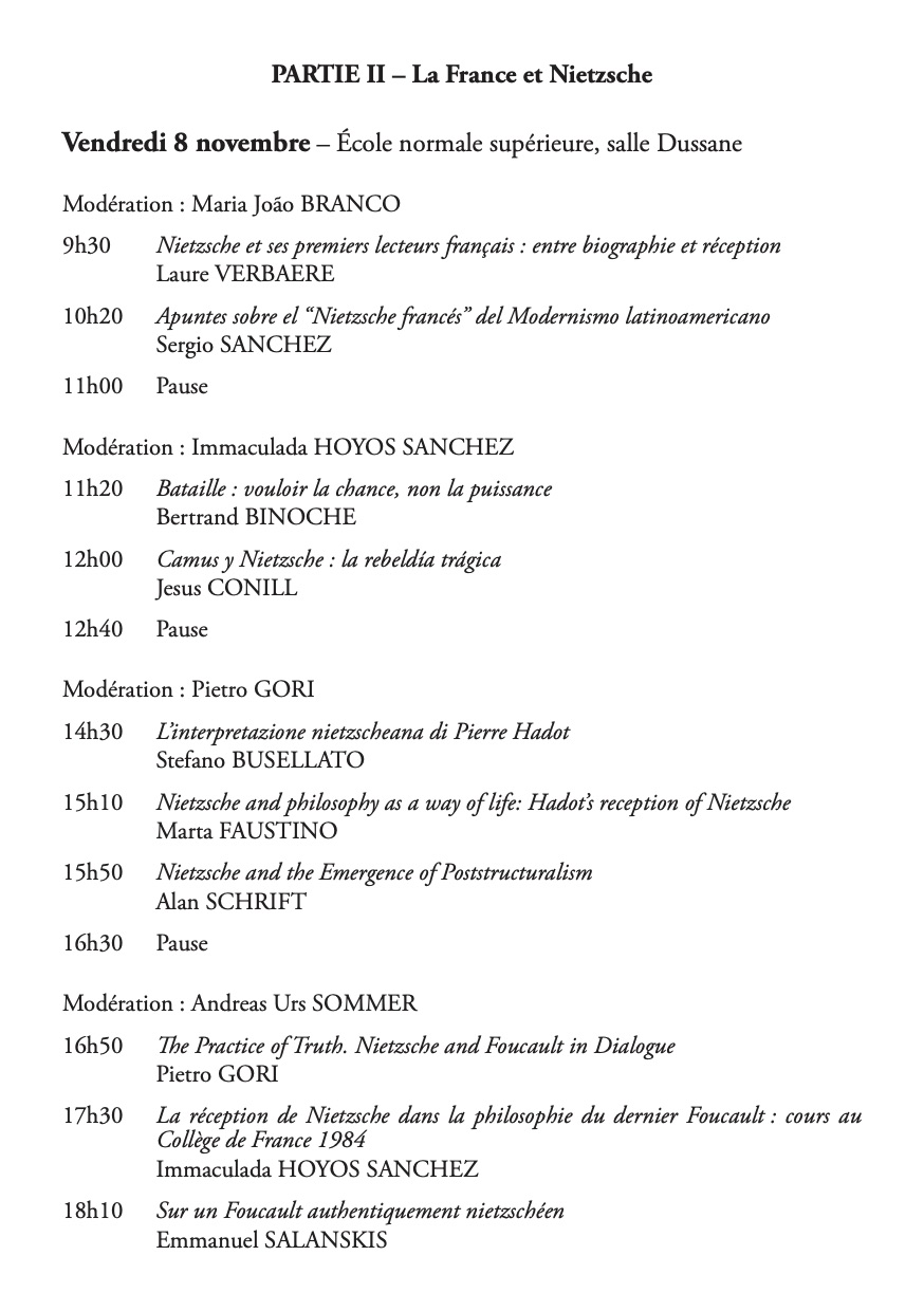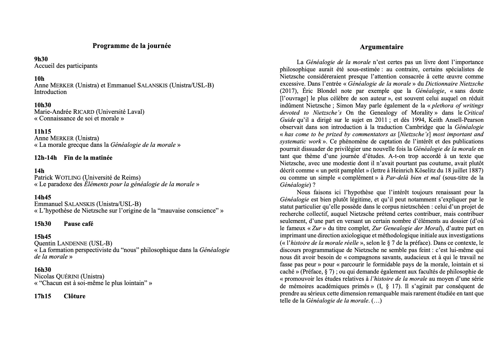 • This important result opened two lines of research. The first consisted in rereading On the Genealogy of Morality without presupposing the existence of a philosophical notion of genealogy, in order to understand Nietzsche’s choice of the word “genealogy” in a more rigorous way. This is what I have tried to do in the first chapter of a new book entitled Études sur la Généalogie de la morale (Studies on the Genealogy of Morality), to be published by the Éditions de la Sorbonne in 2023.