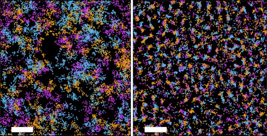 Reconstructed hd-SPT maps for (left) simulations of random motion & (right) experiments on CD44