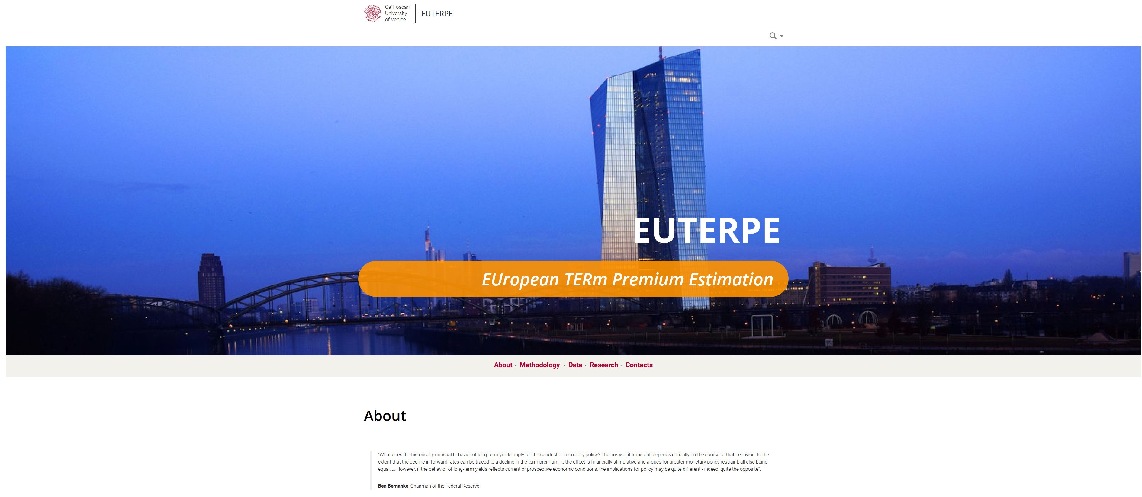 The purpose of the EUTERPE (EUropean TERm Premium Estimation) research project is to implement an innovative system producing timely and reliable estimates of the term premium and its components for government bonds of the Euro Area (EA). In particular, the project develops new different measures for the investors’ perceived risk of holding EA government bonds that take into account the interrelation between bond yields and macro, volatility and global factors. Therefore, the research project intends not only to deliver an academic contribution but also has the ambition to produce a new analytical tool with various applications in the practice of European policymakers and the financial industry.