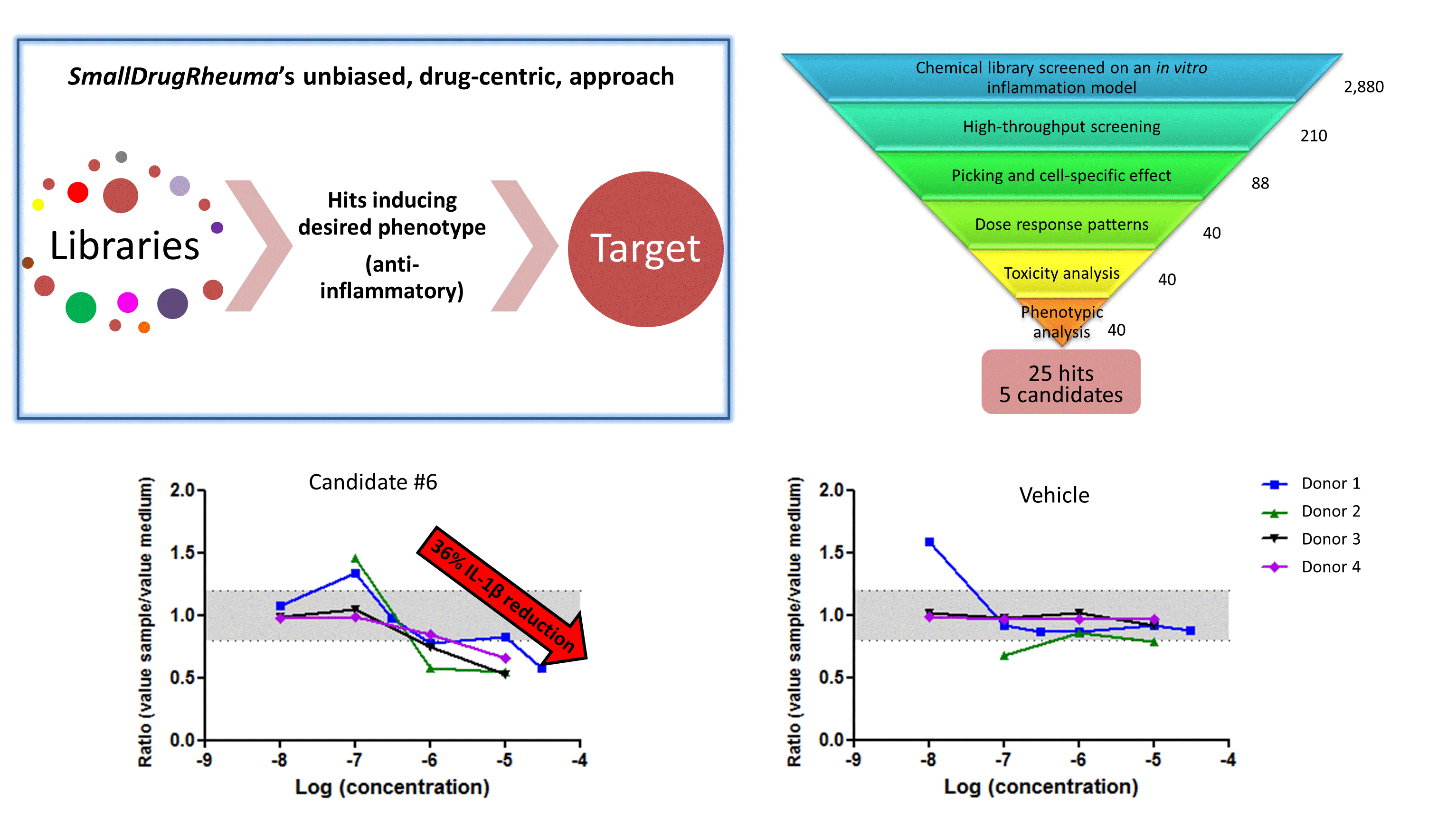 We developed an in vitro inflammation model in human primary immune cells, and tested on it 3,000 different small molecules (including both approved and novel lead-like drugs), covering the whole chemical space. We identified a portfolio of small molecules capable of reducing the secretion of proinflammatory cytokines while do not altering cell viability (n=25). We validated them in several donors and at different concentrations. The extensive screening effort led to 2 strong candidates (repurposing drugs), which allow for 30-50% reduction of IL-1β and/or TNF-α secretion by inflamed PBMCs. Further, we validated this reduction in cytokine secretion in PBMCs from newly diagnosed RA patients which have not yet received any treatment, and identified the intracellular pathways being targeted. In summary, we identified novel compounds capable of reducing IL-1β and TNF-α secretion in both in vitro inflamed HD PBMCs and PBMCs from naïve RA patients.