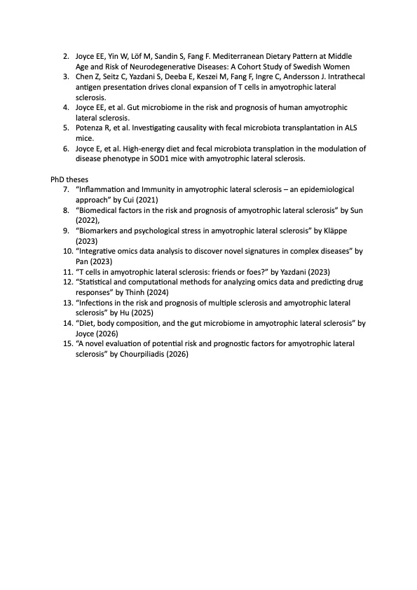 The findings of MegaALS have been actively disseminated to academic, clinical, and public audiences through high-impact scientific publications, conferences, and outreach activities. A complete list of all scientific publications is shown in the section below. In addition, research conducted in MegaALS have been constantly presented at leading ALS conferences, including ENCALS, MND/ALS Symposium, and Keystone Symposium on Neuro-Immune Interactions. Furthermore, MegaALS has supported the training of future ALS researchers including nine PhD theses, among which majority of the PhD graduates transitioned into postdoctoral research, continuing ALS research and expanding international collaborations.