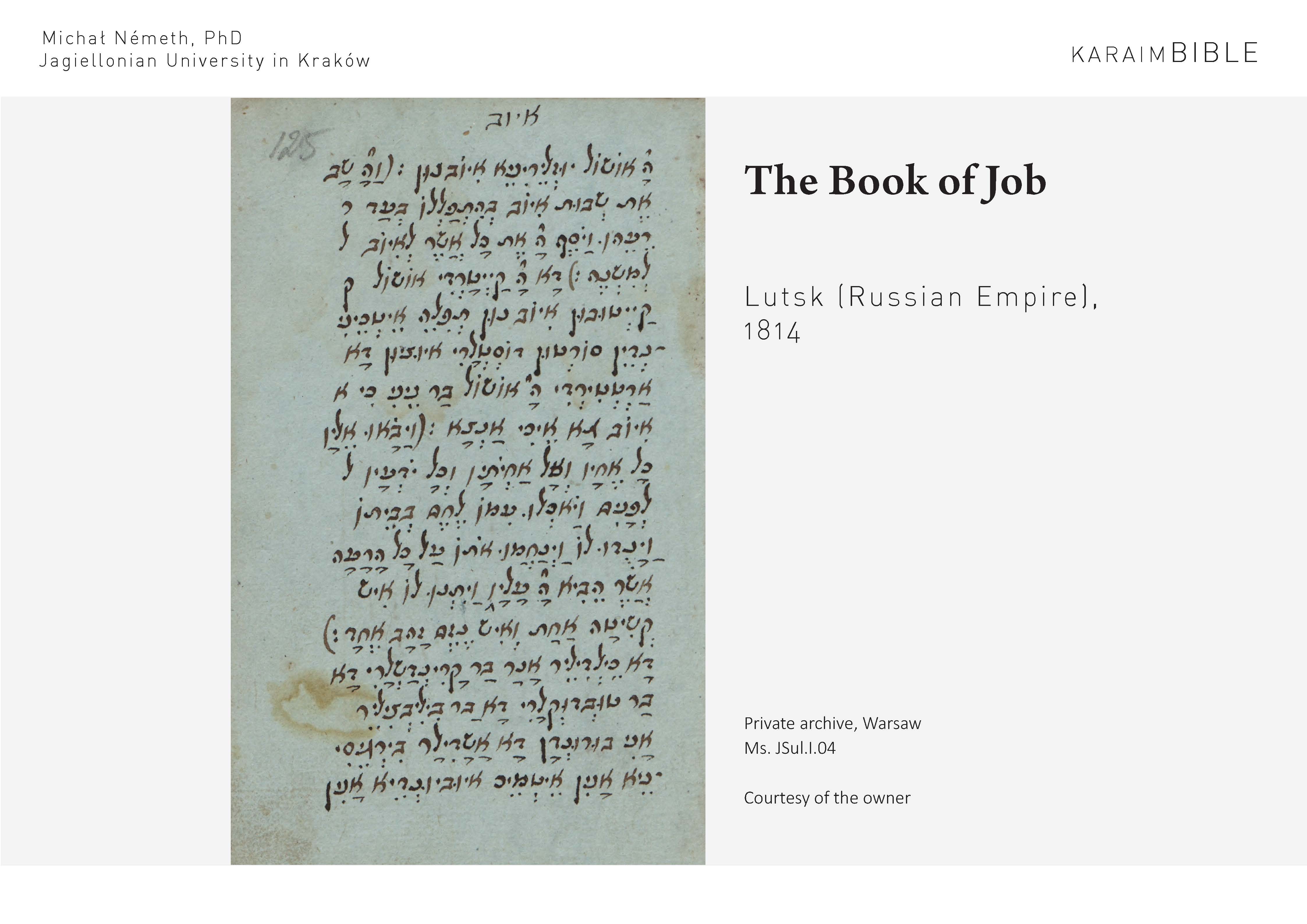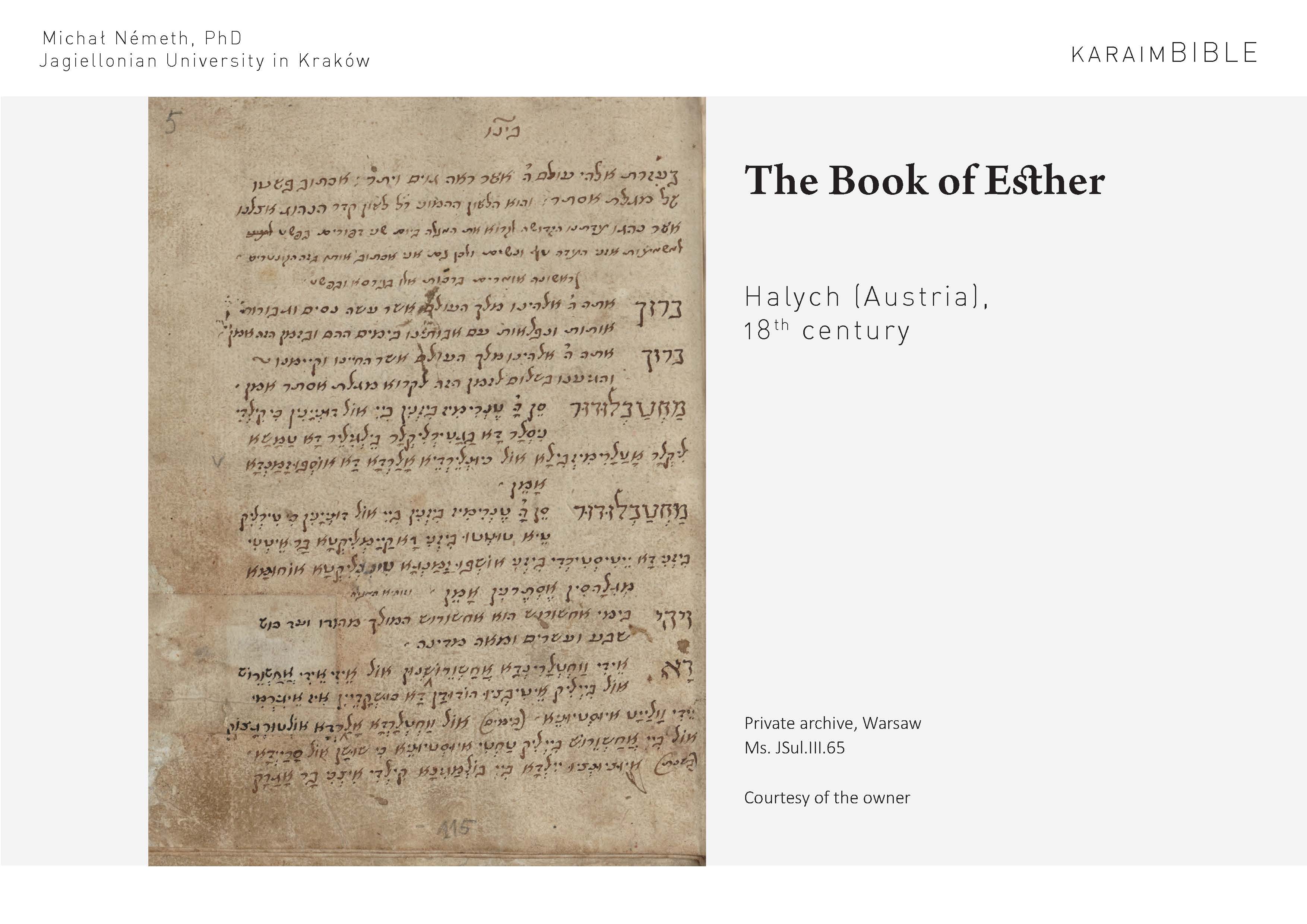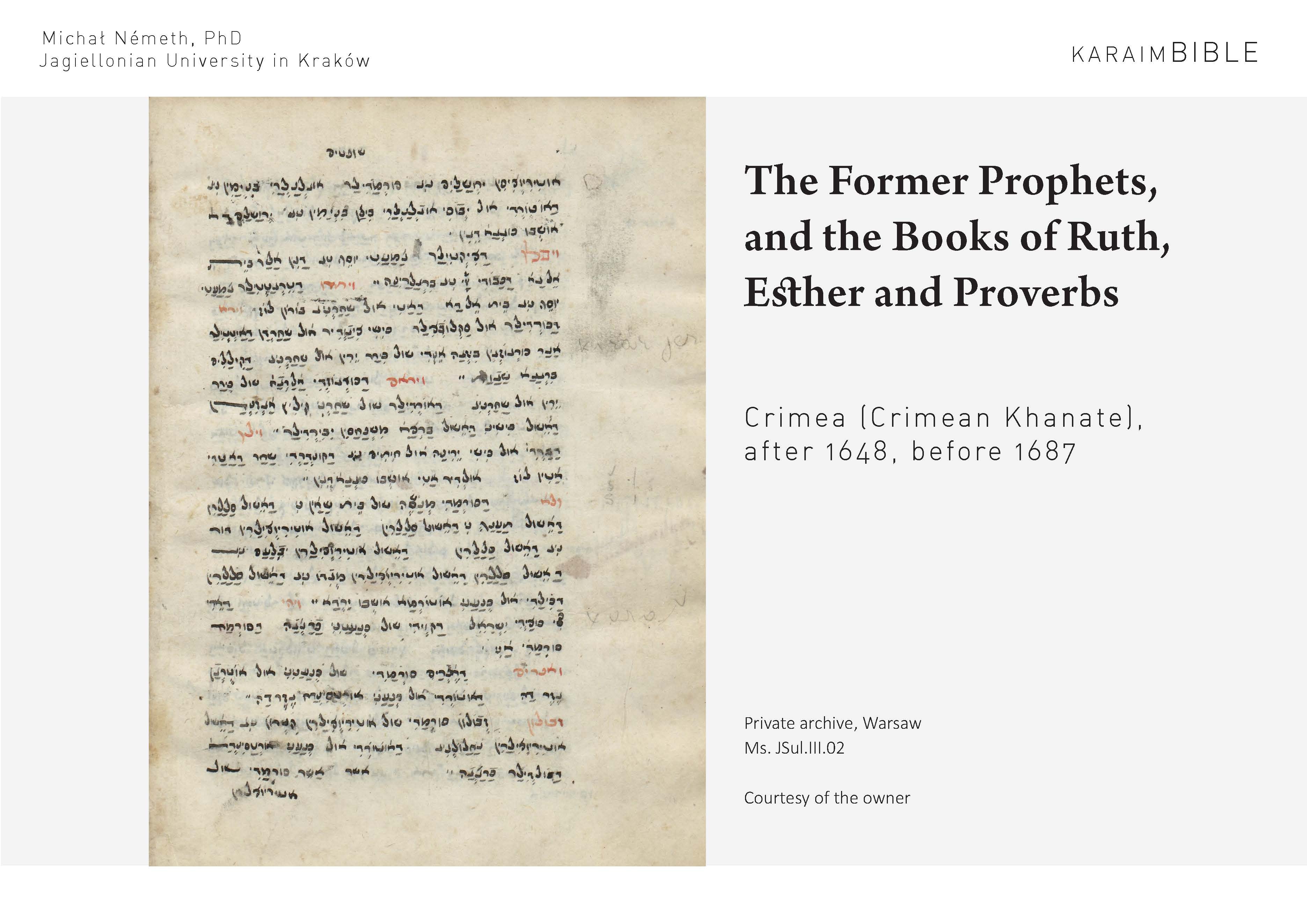 The linguistic treatment of numerous Karaim biblical manuscripts - mss. ADub.III.73 (356 folios), ADub.III.83 (245 folios), ADub.III.84 (224 folios), F305-01 (252 folios), F305-07 (96 folios), F305-90 (430 folios), JSul.I.04 (126 folios), JSul.III.01 (296 folios), JSul.III.02 (74 folios), JSul.III.65 (22 folios), TKow.02 (216 folios), including their transcription, linguistic analysis, preparation of the critical apparatus (philological and linguistic commentaries). The transcription of the entire Torah of the linguistically very demanding Eupatorian print of 1841 has also been completed (based on item no. JSul.IV.02A 194 folios). The largest manuscript, ms. ADub.III.73 also received an English translation. The sources were subjected to a stemmatological analysis. In addition, it is examined whether the biblical manuscripts and the Karaite semi-cursive scripts belong to one or more scribal traditions, in order to better understand the way in which these translations were made. In addition, the Karaite language of the last native speakers has been recorded.