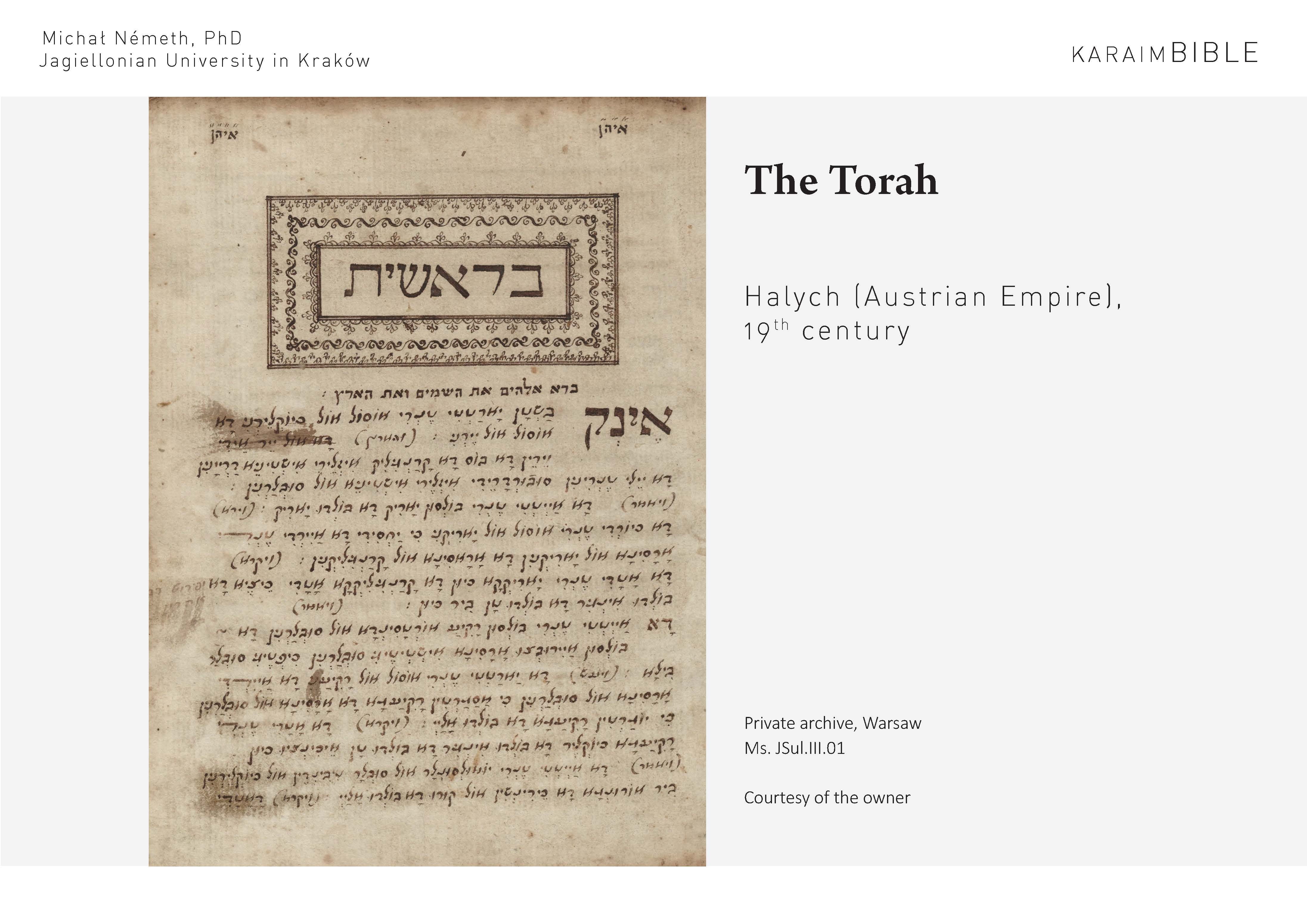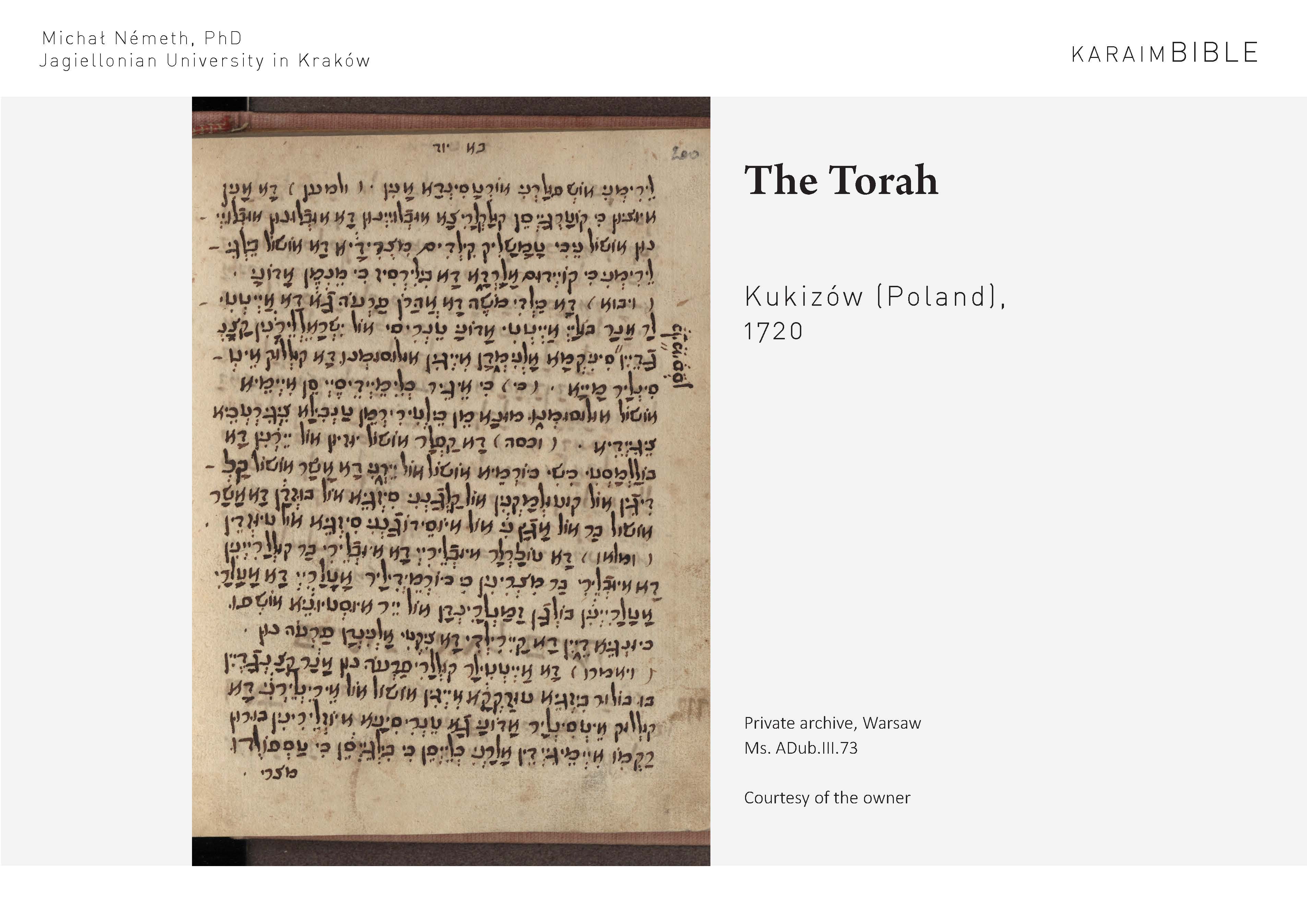 The complete edition of the Torah in Modern Northwest Karaim (in contemporary orthography) was created by the PI in order to fulfil another objective of the project, namely to create the first edition of the Tanakh accessible to the present-day Karaims of Lithuania and Poland. This was a result of a fruitful and continuous cooperation with a native speaker of Karaim (from Lithuania). The edition was published in 2024 and was very well received by the Karaim communities in Trakai and Vilnius.