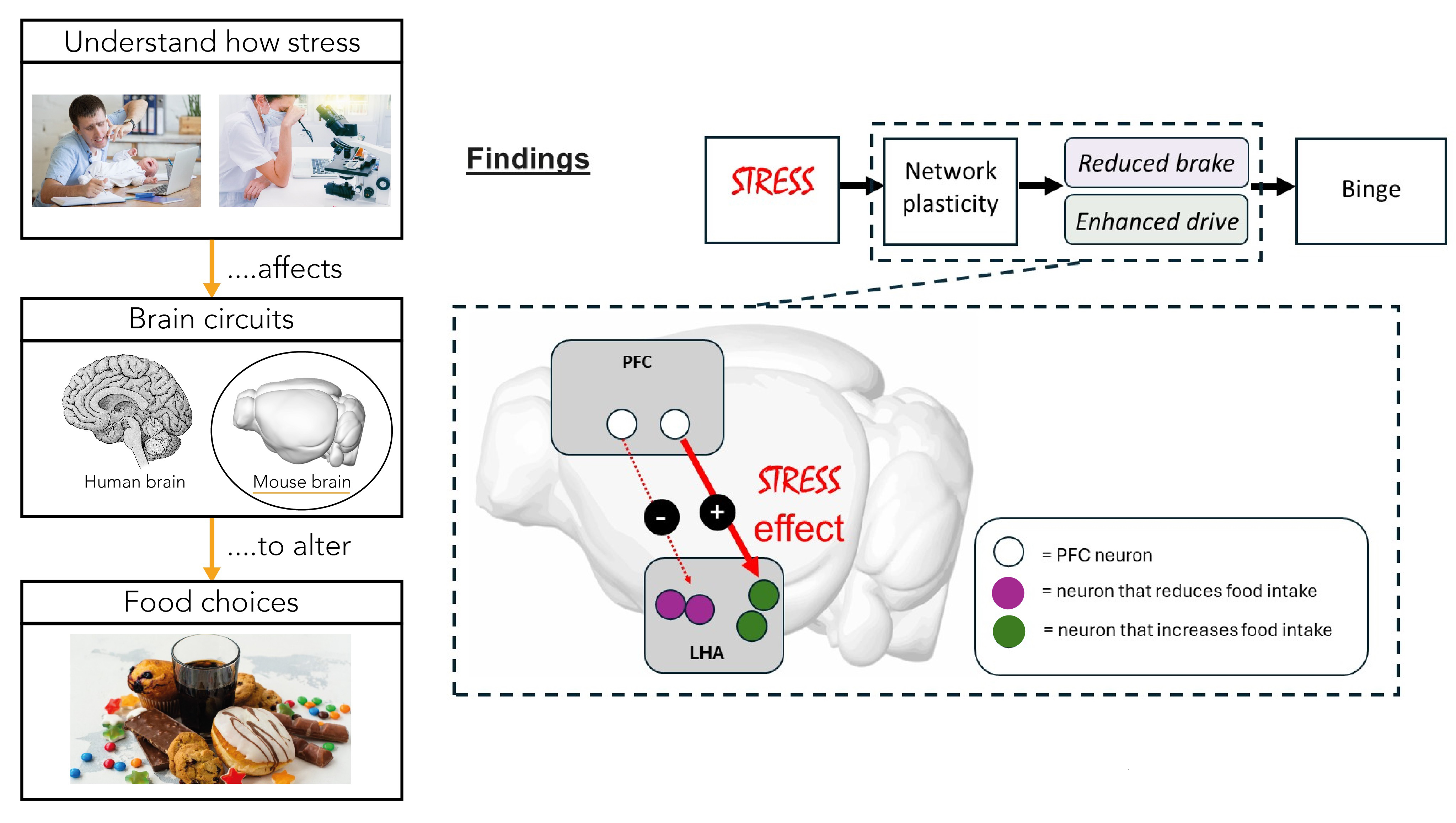 - Indeed if we stimulate the PFC-LHA pathway as a whole, we are even more able to drive food intake than in a non-stressed state.