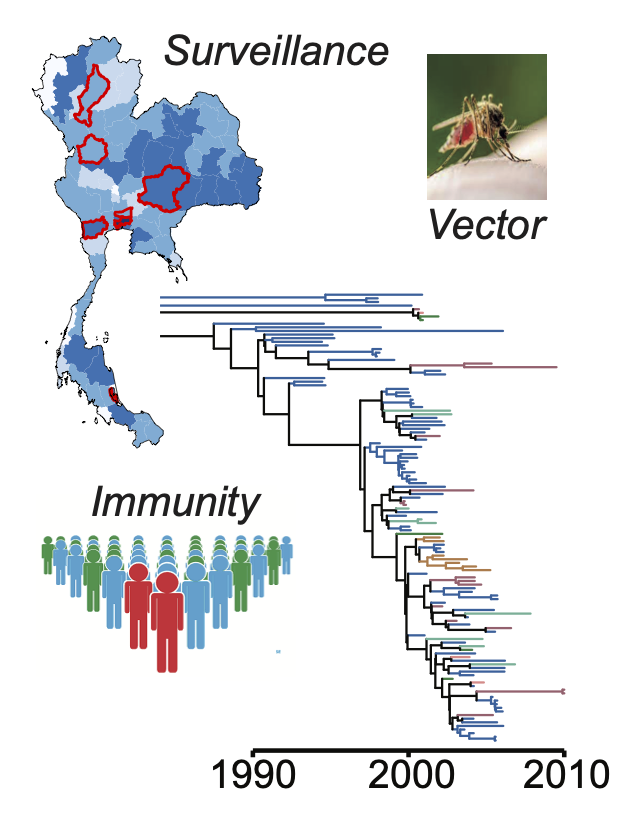 We also used mathematical models to understand the changing immune profile of the population. We demonstrated that the an individual’s risk of getting really sick from dengue is linked to both the specific antigenic properties of the dengue virus that first infected them (but probably didn’t make them very ill at the time) and the properties of the second virus they were exposed (which often did make them very sick). This highlighted for the first time the role of historic pathogen circulation patterns in driving disease risk. These results have important implications for vaccines as they start to be rolled out in places with high historic levels of infection.