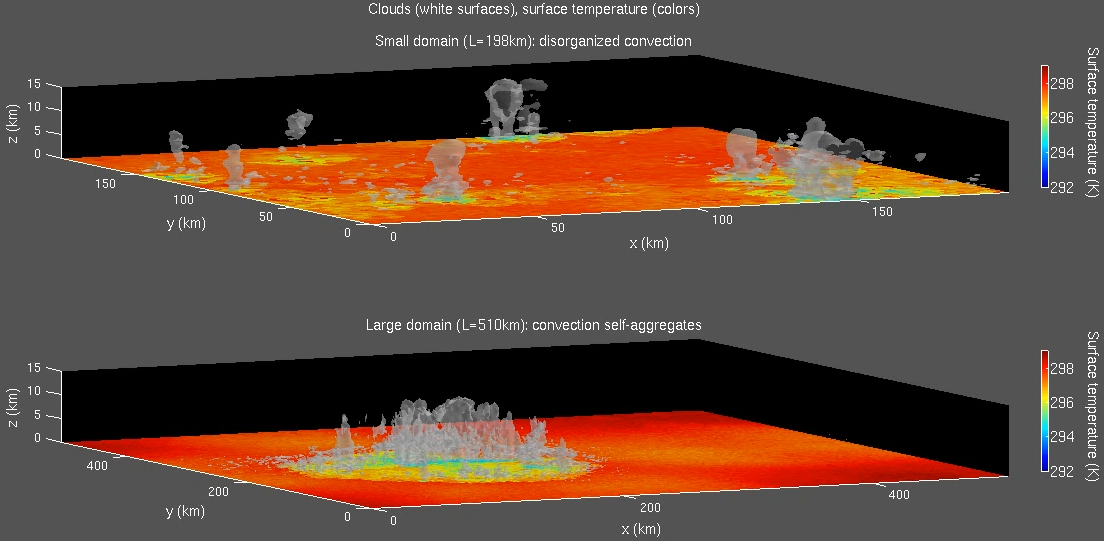 Beyond idealized models and theory, more complex settings and surface interactions were investigated, as well as the data collected during the observational campaign EUREC4A. Our results show the important role of the ocean surface and ocean eddies in the organization of tropical storms. We also contributed to the understanding and the growing literature, on the importance and implications of this phenomenon for the tropical atmosphere, notably for precipitation extremes and tropical cyclone intensification. These important implications of cloud clustering will be further explored in the remaining time of the project.