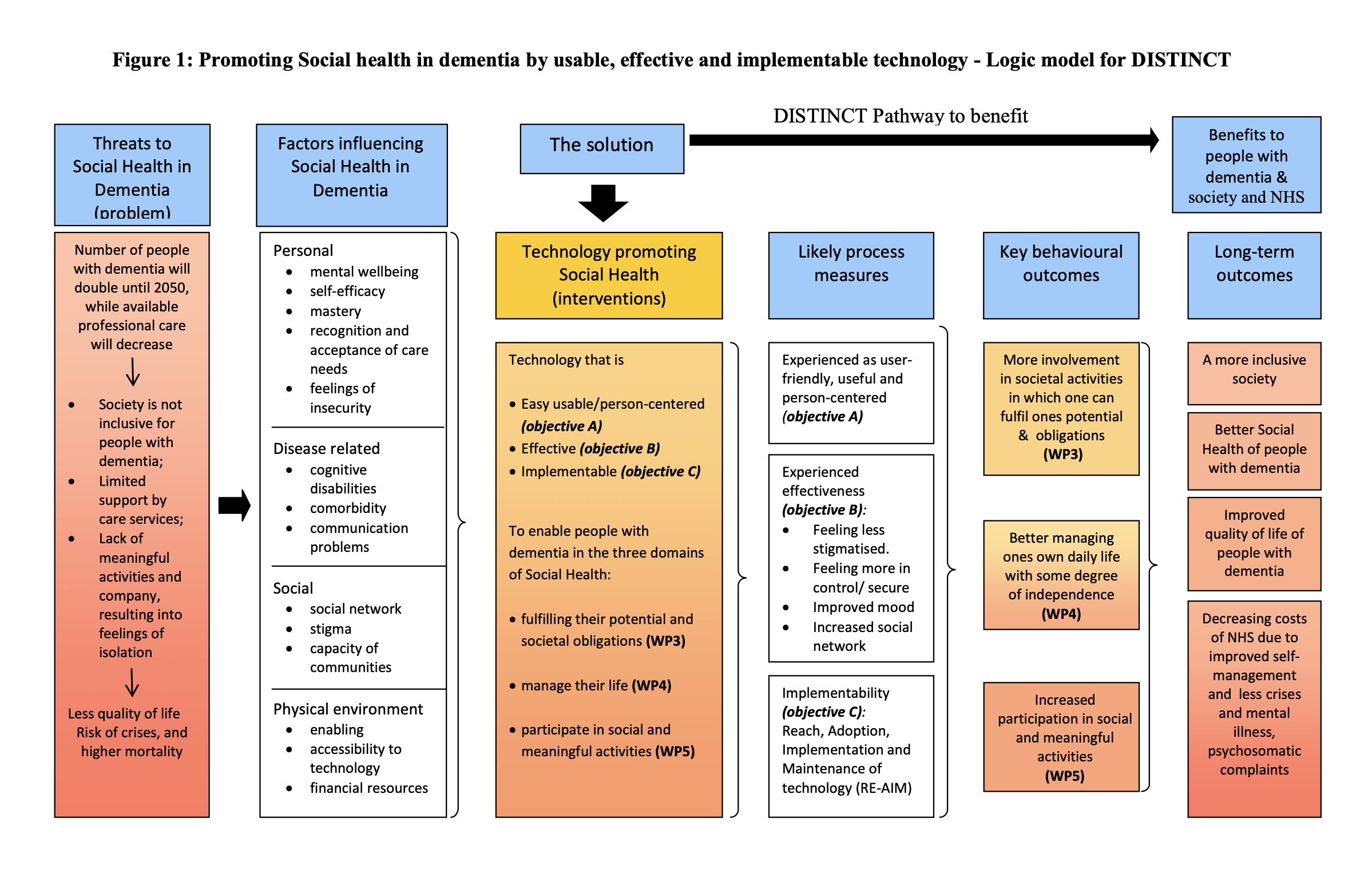 DISTINCT will contribute to a more inclusive society, better health and improved quality of life of people with dementia and family carers and decreased costs because of improved self-management and less crises and mental illness (Figure 1 DISTINCT Logic Model). DISTINCT will enhance the European Commission’s Public Health Strategies (2008) and the European Parliament resolution of 2011 for the ‘European Initiative on Alzheimer’s disease and other dementias’ as an EU health priority and supports member countries’ national dementia strategies.