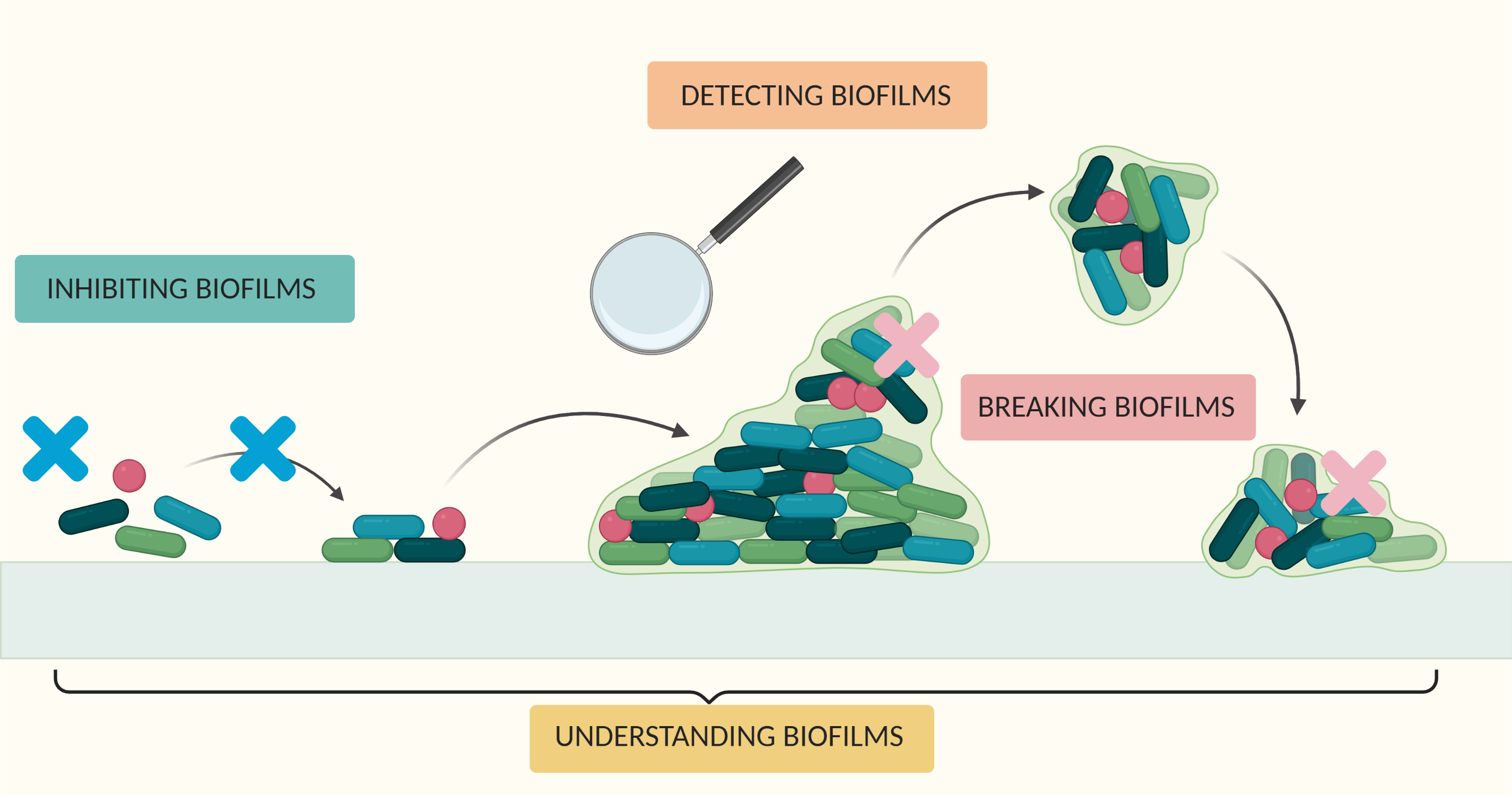 1. Understanding biofilm formation: it is a very complex multistep process, in which a variety of biological and physicochemical processes take place. Scanning electrochemical probe microscopy techniques are powerful tools to explore these processes at a single-cell level and provide a basis for understanding early stage biofilm formation.
