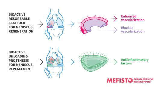 MEFISTO aims to prevent post-meniscectomy OA with innovative bioactive materials. Specific objectives include developing two treatment solutions: a bioactive degradable scaffold for younger patients and a non-degradable implant with drug delivery for older patients with advanced knee OA. In addition, a predictive treatment algorithm based on morphological profiling of meniscectomy patients is created and the socio-economic impact of the meniscus solutions analysed.