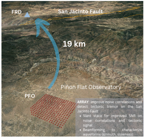 In April 2022, we deployed the first time ever long-term nodal seismic array with 300 stations recording seismic data for almost 3 years continuously at 10 km from the San Jacinto Fault. The analysis of the first data is fascinating. For example, we discovered a new powerful source of useful noise that seems to be associated with sedimentary basin resonance fed by the energy of vehicle traffic. We are investigating if this strong seismic energy could be used to perform noise-based monitoring of the fault. We also detected for the first time at this scale (a few km depth) changes in seismic velocities due to deformation of the Earth induced by solid earth tides. We find a very high sensitivity of seismic velocities to deformation induced by tides which we interpret as the effect of the high permeability and high fluid pressure in this region due to tectonic deformation and past earthquakes. This result will be instrumental when interpreting velocity changes associated with tectonic movements.