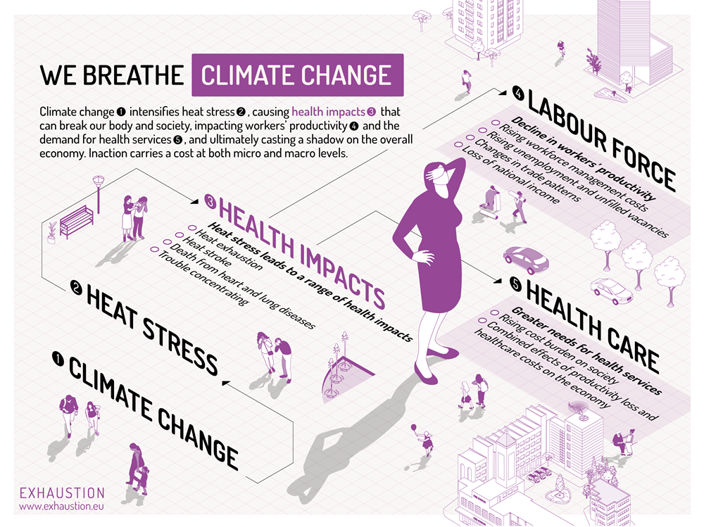 Major scientific advancements and results of EXHAUSTION are related to the following: 1) Exposure-response functions for the relationship between ambient temperature and mortality and hospitalization are established for the European population. 2) Evidence on strong interactive effects between temperature and air pollutants on mortality have been established for Europe, pointing to particularly strong modifying effects for respiratory endpoints and for particulate air pollution (PM2.5) effects on heat-related mortality. 3) Evidence on the impact of a range of contextual and individual vulnerability factors on the heat-health relationship have been established for Europe, pointing to particularly strong modifying effects of urban characteristics (high population density, lack of green space, air pollution). People with chronic pre-existing diseases and the elderly were shown to be at higher risk. 4) High-resolution projections of health relevant meteorological indices and air pollutants have been established, including for cities. 5) A new fire forecasting model has been developed and applied to historical periods and to three CESM scenarios (SSP126, SSP245, SSP370) 2015-2099 to produce global emission time series. Fire emission data were applied in global simulations and to regional European runs. 6) Evidence on increasing contribution of fire emissions to PM2.5 pollution over Europe and associated increased fire-attributable health effects was established. 7) Projections for temperature-related mortality in Europe at city, country, and regional level for the three scenarios towards 2100 has been established, showing a net increase (i.e. the net effect of decreased cold-related deaths and increased heat-related deaths) of more than 2 million excess deaths attributable to climate change for SSP370. For SSP126, projections indicate that lives claimed by climate change would peak around 2060 and could sum to about 0.73 million lives by 2100. 8) Findings related to the modifying effects of PM2.5 for heat-related deaths were used to estimate the benefit achieved from complying with WHO’s Air Quality Guidelines: 150,000 heat-related deaths can be avoided over the next 25 years if the WHO AQG are achieved in Balkan and Mediterranean. 9) The economic consequences of the health effects of increasing temperatures over Europe were estimated by the means of empirical relationships (work presenteeism and sick leaves) and by modelling techniques. Using bottom-up modelling (EVA model) and exposure-response functions based on the city level data, historical and future heat-health burden was estimated and monetized (via VSL), indicating that the annual cost of heat-related cardiopulmonary deaths could reach up to nearly 3% of the national GDP for some countries by the mid-century. The GRACE model, a computable general equilibrium model frequently employed in various climate change studies ahead of the EXHAUSTION project, was further developed by adding a module enabling analyses of health-related impacts of climate change on the labor market. The model was implemented for three countries, Norway, UK and Italy. The cost of health services is anticipated to rise in all three countries, whereas socioeconomic impacts generally showed large variations.