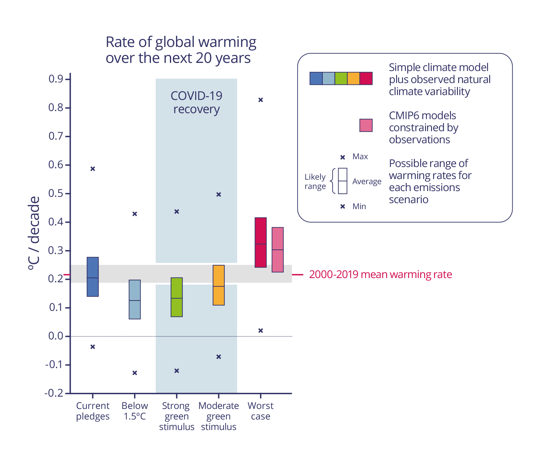 Near-term warming rates have also been investigated further using climate emulators and more complex climate models, highlighting how strong climate action limit the amount of overall warming and slow down warming rates in coming decades.
