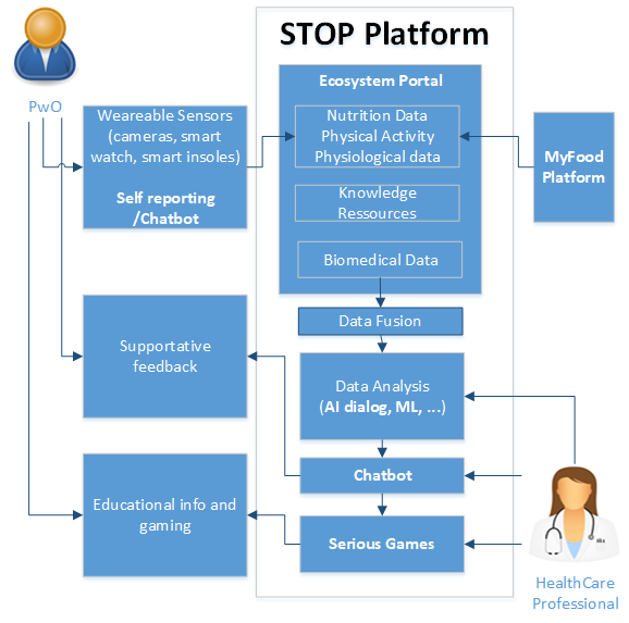 o Establishing a data and Knowledge Ecosystem as a basis for the STOP Portal to enable healthcare professionals in decision support, and obese persons in analysis and feedback of health information to optimise healthy nutrition.