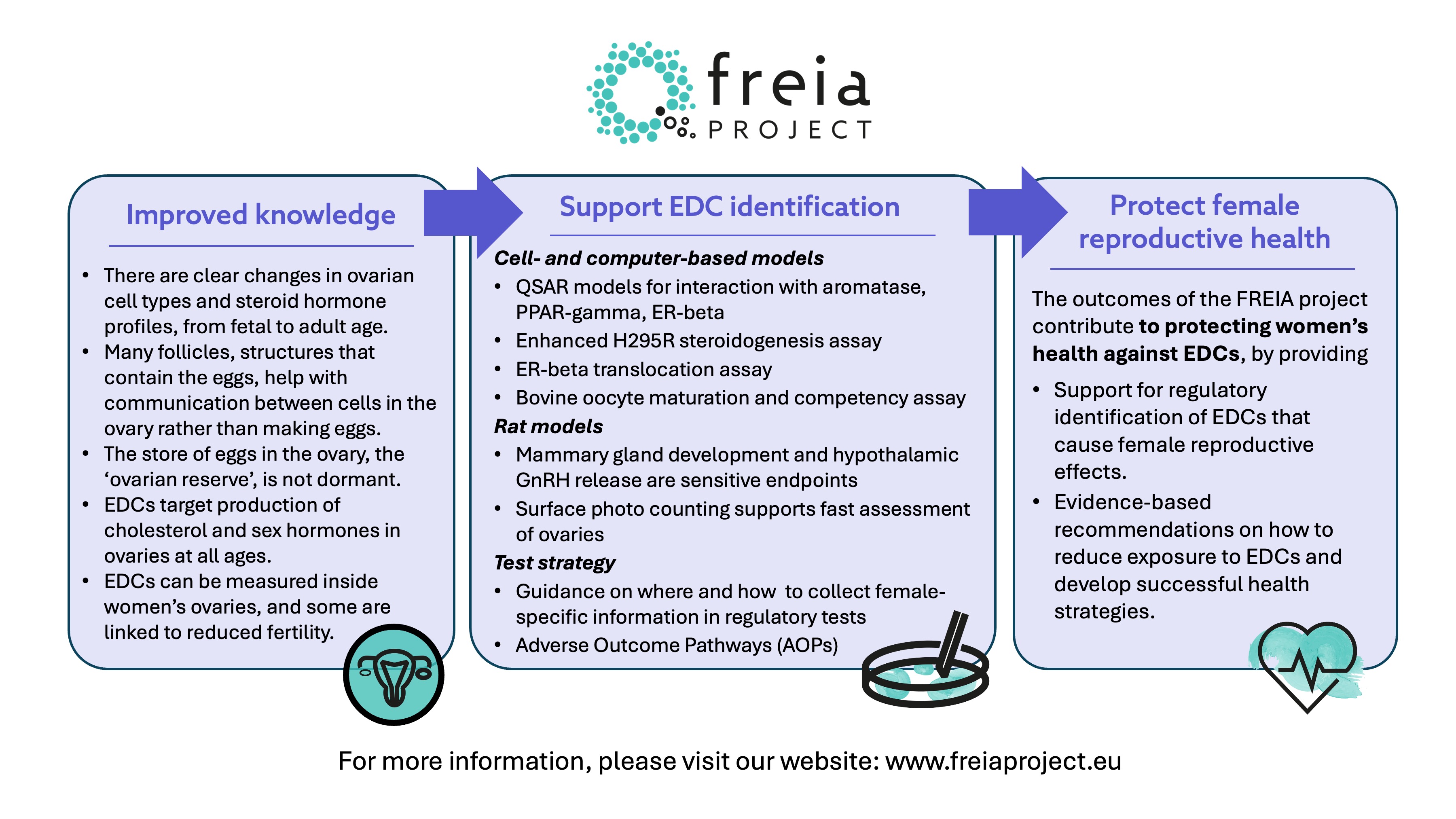 On the FREIA website (www.freiaproject.eu) general background information on EDCs and female reproductive health can be found, as well as project-specific information, including webinar recordings, peer-reviewed scientific publications, databases, FREIA factsheets, infographics and reports. FREIA is one of the eight projects on test method development for EDC identification within the EURION cluster (www.eurion-cluster.eu).